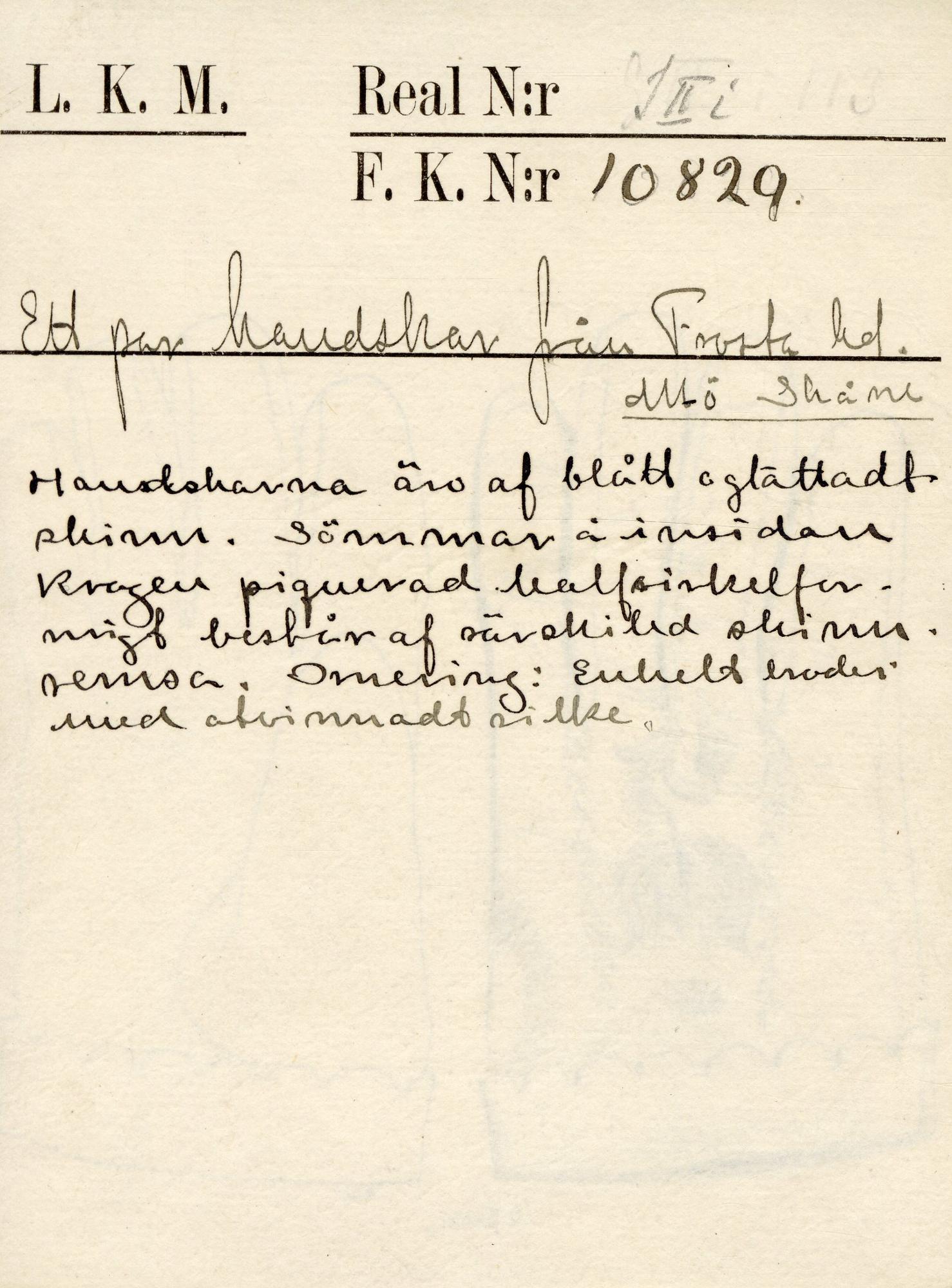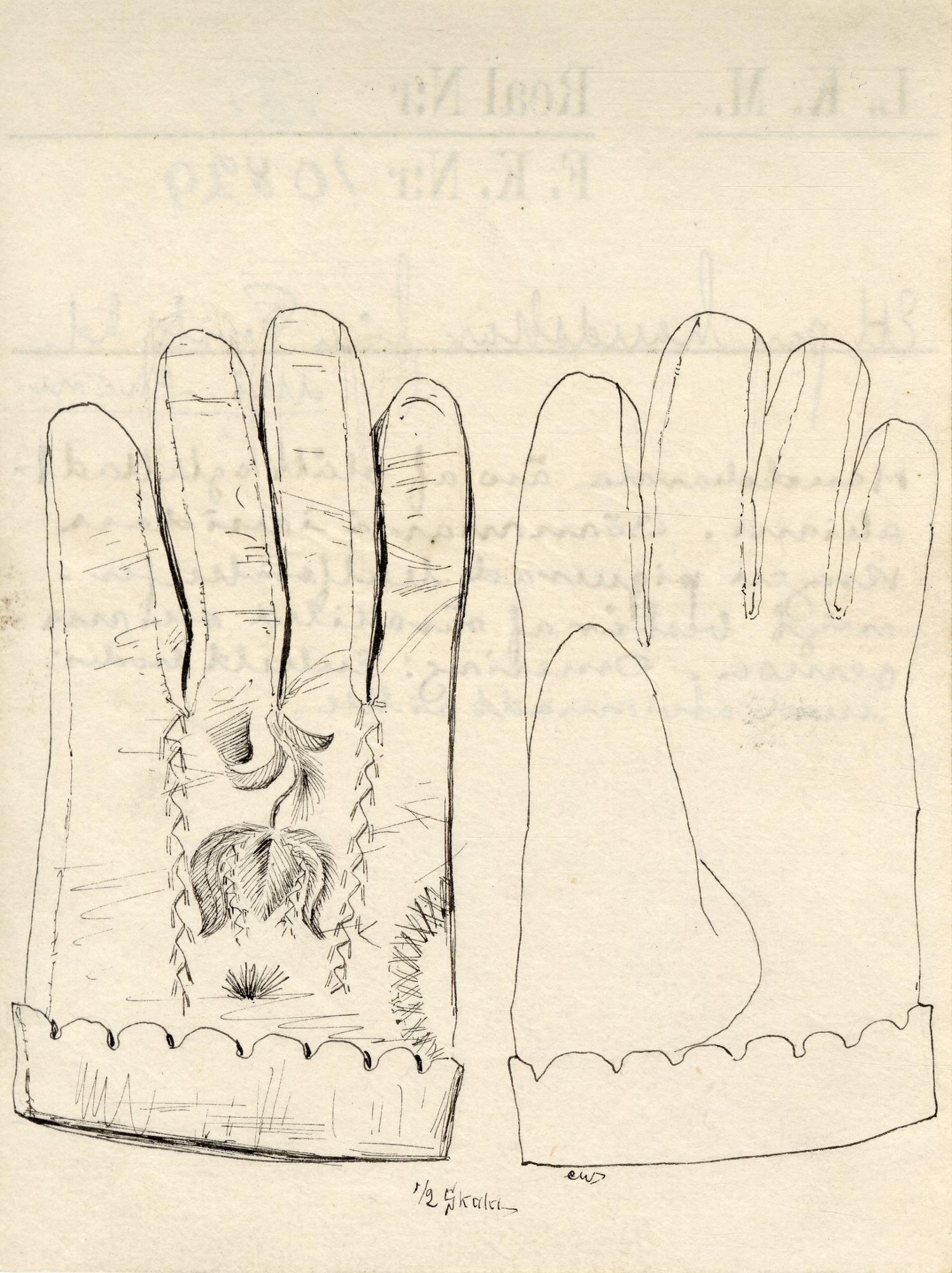 Blå, av skinn. Broderade med silke i gult, brunt och rosa. Stiliserat bladmönster och bårder. Påsydd, övervikt taggad kant på skaftet.