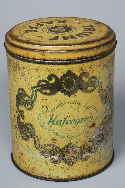 Cylindrisk med utanpåliggande lock. Bottenfärg gul, dekor i grönt och guldfärg. Text på lockets ovansida "TRIUMF KAFFE AKTIEBOLAGET A.G. LINDGREN YSTAD". På burkens sida "Hafregryn".