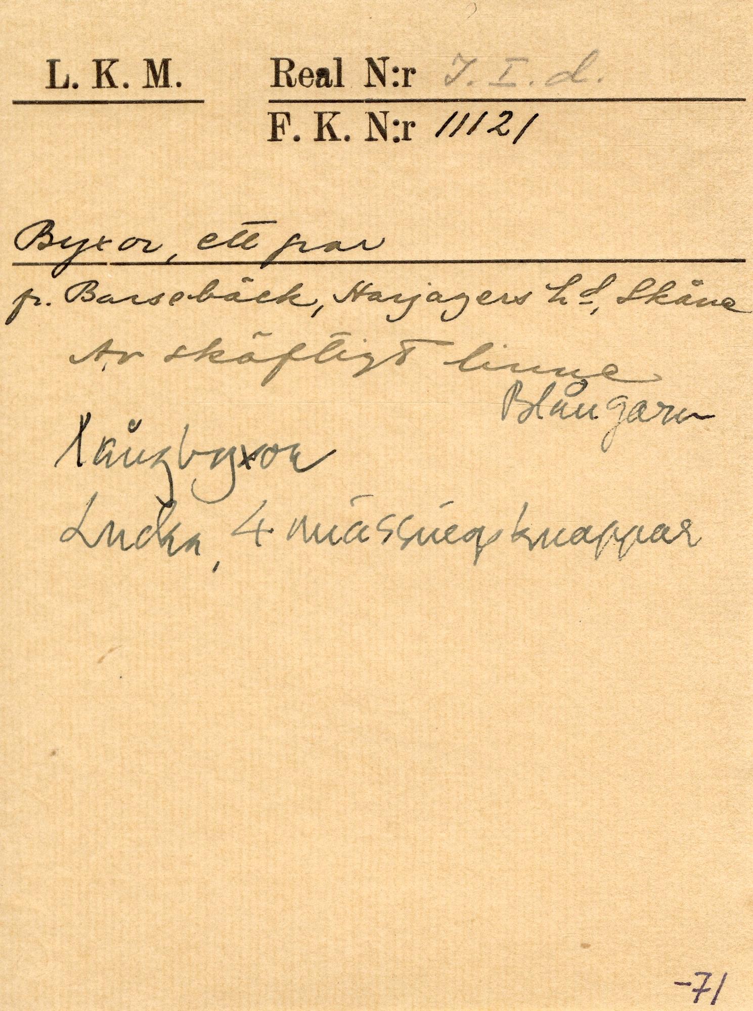 Byxor, ett par fr. Barsebäck, Harjagers hd, Skåne Av skäftigt linne Blångarn långbyxor Lucka, 4 mässingsknappar