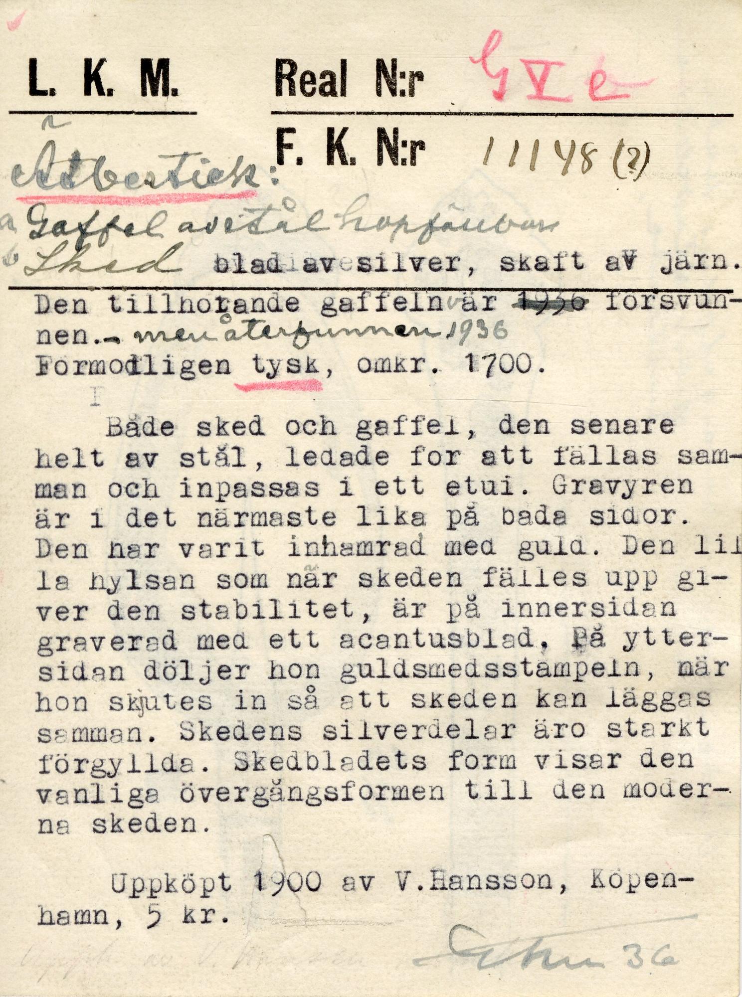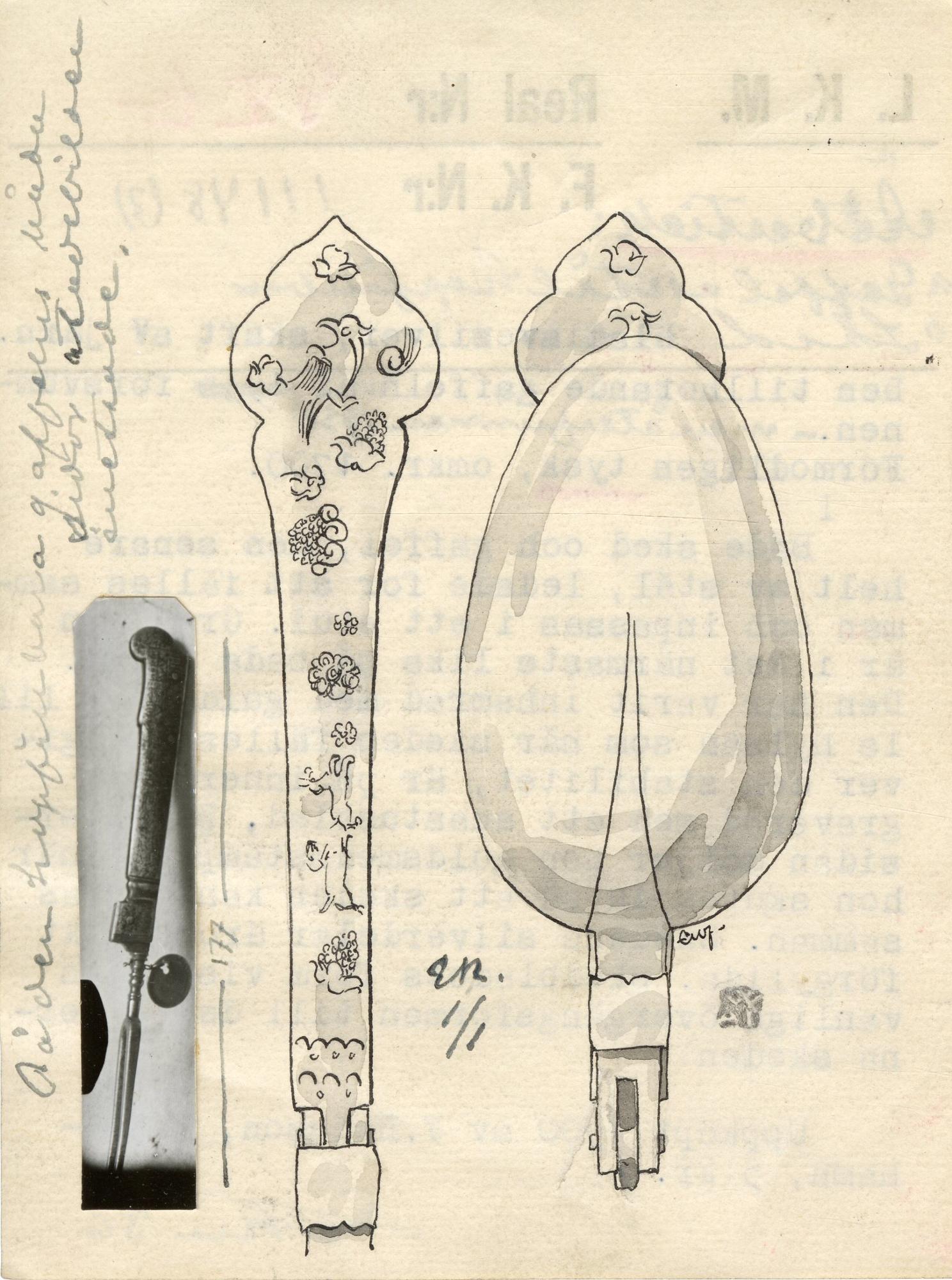 - Med fällbara uddar in i en skåra i skaftet. Rester av stämplad dekor på skaftet på den tvåuddiga gaffeln och resten av guldfärgad text på den treuddiga L'amilie (?) vous... Gaffel: L 19 cm,treuddig, gaffel: L 17,8 cm, tvåuddig.