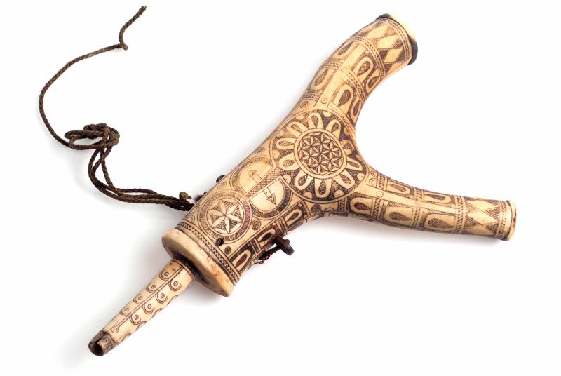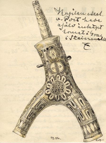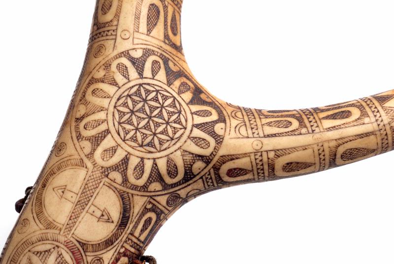 Hjorthorn med två grenar. Geometrisk ristad dekor. Delvis infärgad med rött.