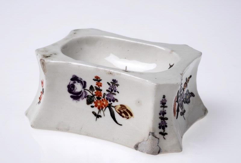 Rektangulärt med konkava sidor och ovalt skålat utrymme för saltet. Falsade hörn. Glaserat. Vit botten med målad blomdekor i lila, orange blått och grönt. Vid inventering fanns endast ett saltkar.