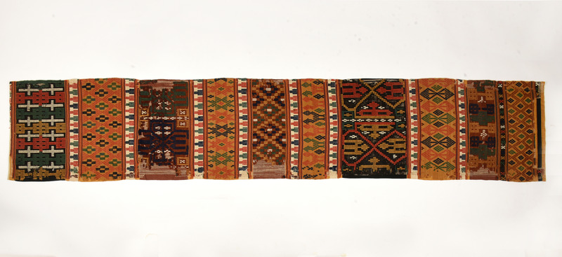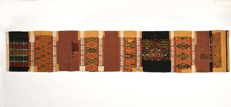 Långsmal vävnad med lin i varpen och ull i inslaget. Linvarpen är tvåtrådig, Z-spunnen och S-tvinnad, 11 trådar/cm sked 55/10. Inslagsbotten 1-trådigt, S-spunnet ullgarn 22 tr/cm. Mönsterinplocket, 2 tråder S-spunnet, tvinnat och otvinnat. Tvärrandig med breda mönsterbårder på svart, brun eller gul botten och smala mellanbårder med vit botten och dukagång i rött, blått, grönt och svart. De gulbottnade mönsterbårderna har främst halvkrabbamönster medan de svarta och bruna har dukagångsmönster. Konserverad.