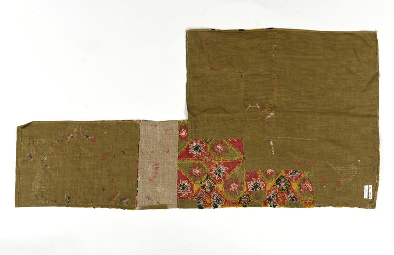 Rektangulär vävnad med lin i varpen och ull i inslaget. Linet, möjligen blångarn eller hampa, är 2-trådigt och S-tvInnat. Sked 45/10. Inplock med 3 trådar ullgarn, det gula är Z-spunnet, de övriga är S-spunna. Mönster med tätt satta, runduddiga åttabladsstjärnor med en stjärna i var udd i de fyra mittersta. och ett hjärta i var udd i de fyra vid kortsidorna, två per sida. Mellanstjärnorna fylls det ut med små flerfärgade fyrkanter och hjärnan. En bröllopsdyna? Kortsidorna har en mörkare bård och vid den ena finns fragment av en bård i dukagång. Spår av dun på baksidan. Konserverad.