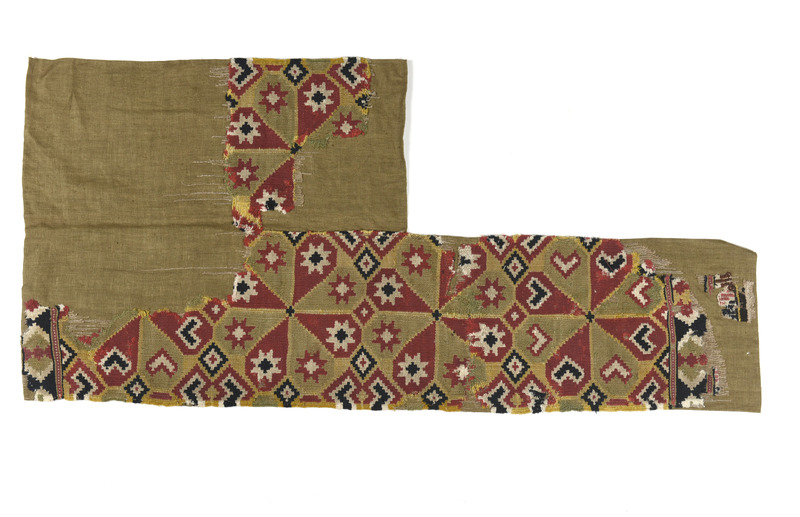 - Rektangulär vävnad med lin i varpen och ull i inslaget. Linet, möjligen blångarn eller hampa, är 2-trådigt och S-tvInnat. Sked 45/10. Inplock med 3 trådar ullgarn, det gula är Z-spunnet, de övriga är S-spunna. Mönster med tätt satta, runduddiga åttabladsstjärnor med en stjärna i var udd i de fyra mittersta. och ett hjärta i var udd i de fyra vid kortsidorna, två per sida. Mellanstjärnorna fylls det ut med små flerfärgade fyrkanter och hjärnan. En bröllopsdyna? Kortsidorna har en mörkare bård och vid den ena finns fragment av en bård i dukagång. Spår av dun på baksidan. Konserverad.