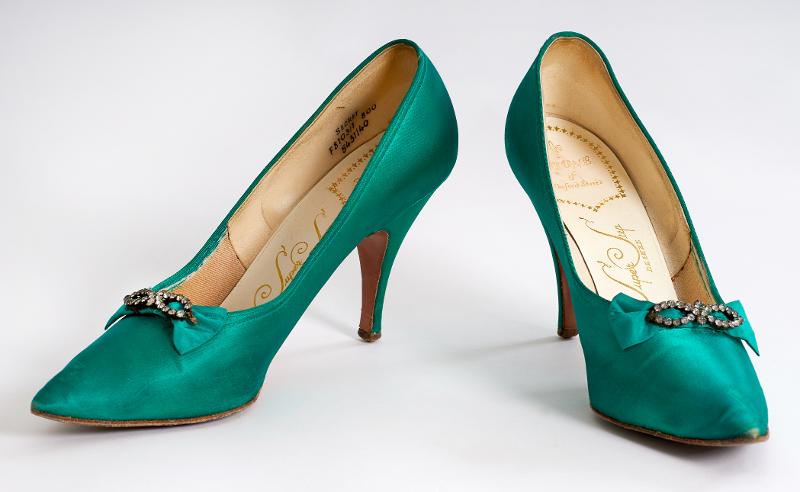 Gröna; strassrosett; spetsig tå; mycket smal klädd klack. Nåtlingen helskuren med baknåt. Kantband, gros-grain. Foder: främre halvan vit bomullskypert, bakre halvan vitt skinn. Bakstycket förstärkt med stålskena. Innersula av tunt vitmålat läder med guldtryck. Lädersula klistrad, går fram över klackfronten. Klacklapp av läder 1 cm bred och med stålstift. Intryckt i bakkappan: secret F 8103/1 800 5431/40; hör till aftonklänning. Mått: klack H 9,5 cm, Br 1 cm. Defekter: något slitna i tån och mitt bak, även längst ner på klacken.