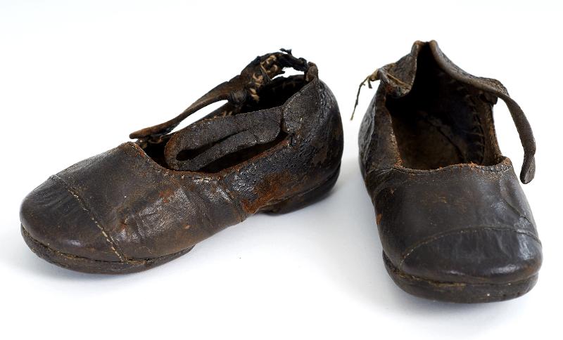 Svarta (bruna), handsydda. Nåtlingen består av tåhätta, framstycke och bakstycke. Vristremmen har en fastsydd bit med ett långt hål. Den andra biten har tre små hål. Randsydda. Lädersula. Pliggad klack. Innersula av brunt läder. Mått: klack H 0,4 cm Br 3,5 cm. Defekter: lädret hårt och sprucket i bakstycket: båda sönder och lagade i hälringningen; på ena skon fattas ena delen av vristremen.
