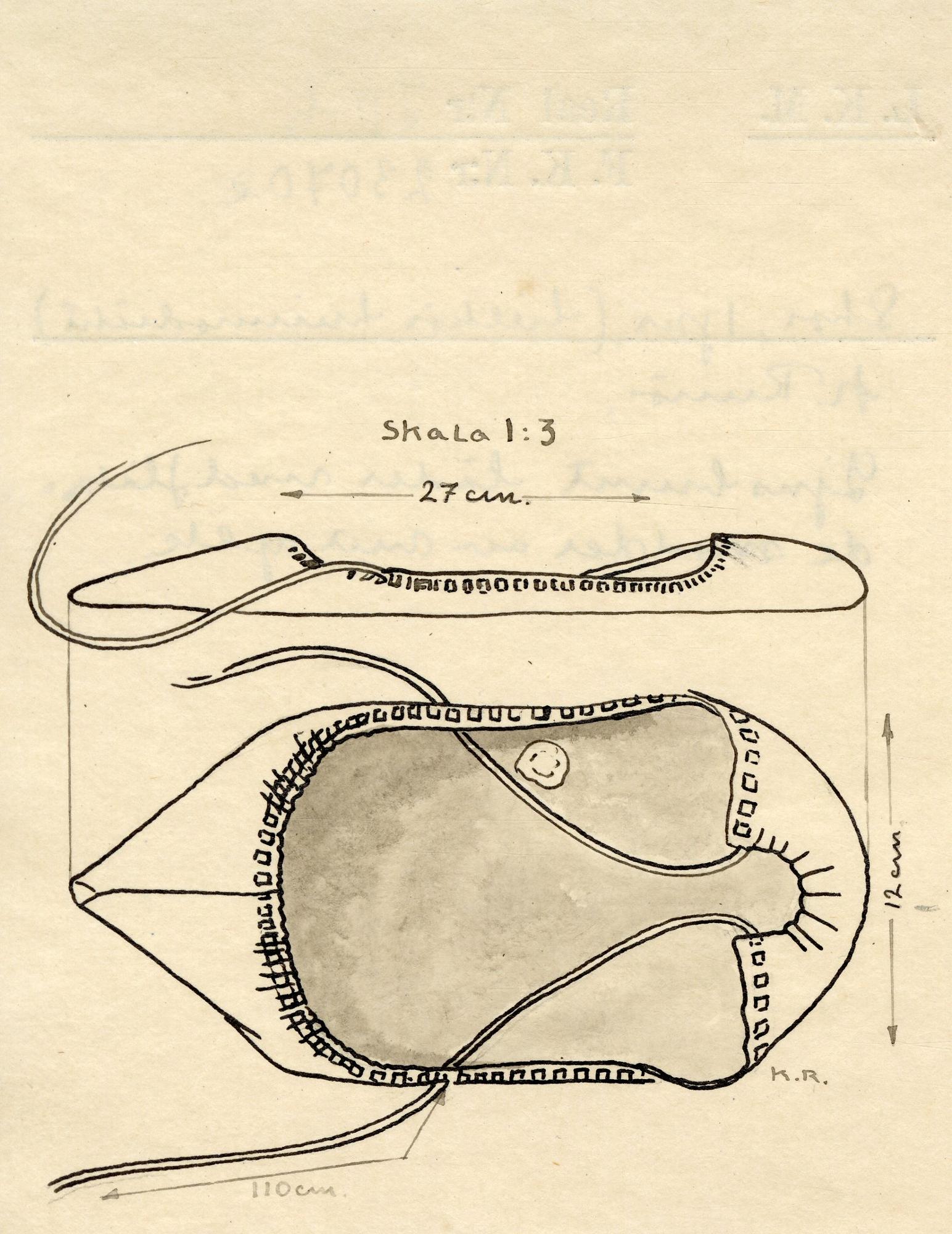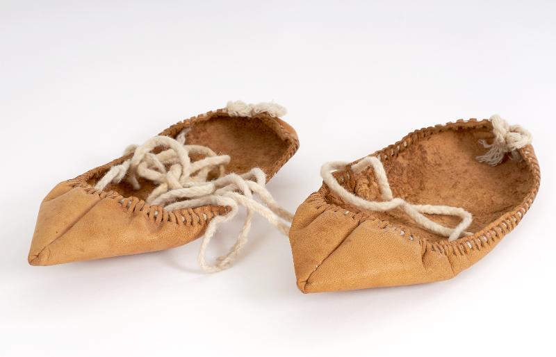 - Av naturfärgat skinn. Gjort av ett enda rektangulärt stycke som är hopsytt i en vinkel vid tårna och rynkat runt om. Sammanhållen av en tjock vit yllefläta, vilken också är virad runt vristen. Defekter: små hål i skinnet; banden trasiga och uppflisade, ihopknutna, en bit av.