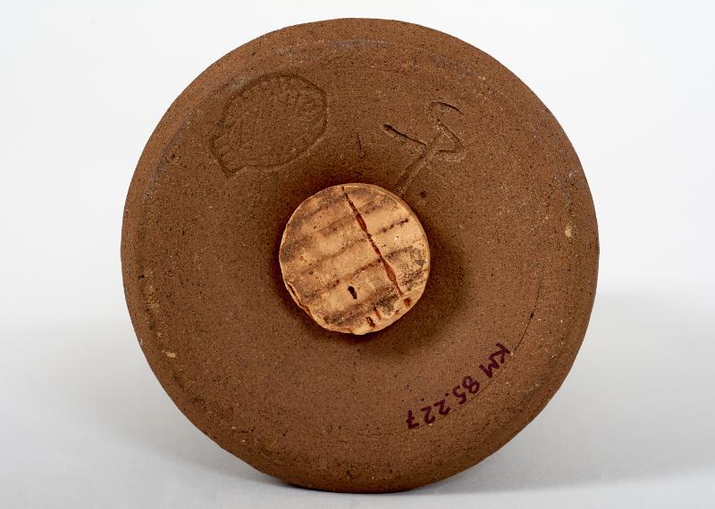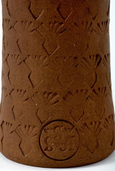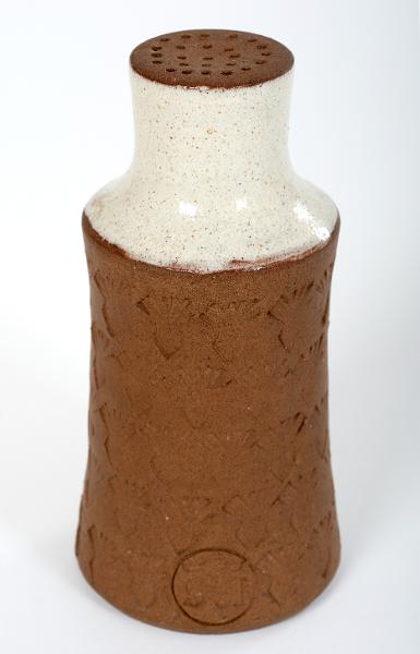 Cylinderformad med något konkav sida. Markerad skuldra, cylindrisk hals med plan ovandel med ett flertal små hål. Brun lera med vit tennglasyr på hals och skuldra. På kärlkroppen stämplad dekor i form av stiliserade sockerbetor samt firmamärke SSA. I botten ett påfyllningshål med kork.