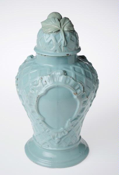 Med lock. Ljut turkosfärgad. Flack reliefornering med det för fabriken typiska flätkorgsmönstret.