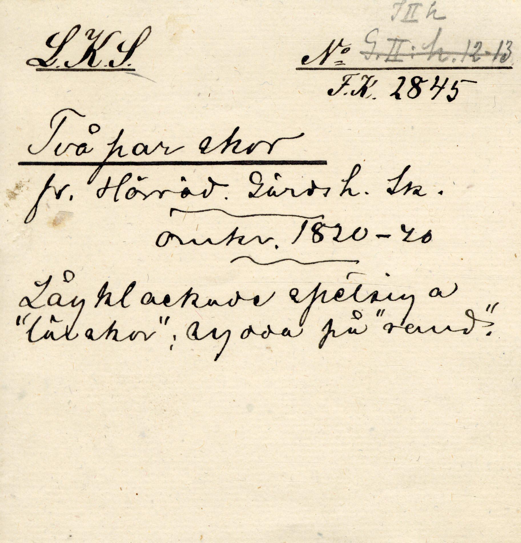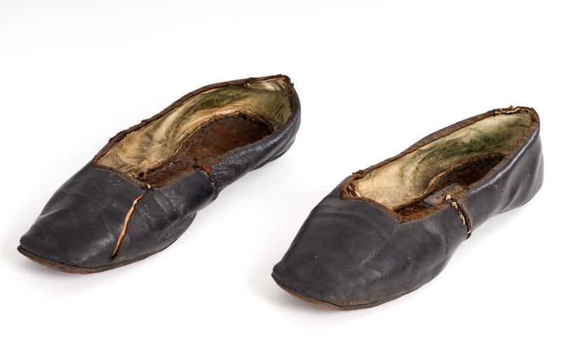 Svart skinn; klacklös. Vitt skinnfoder i bakre delen av skon. I framre delen linnefoder, ljust. Band kantar ringningen. Defekter: skinnet mycket sprucket, framförallt på ena skon fram; sömmarna mycket trasiga; bandet i ringningen mycket trasigt.