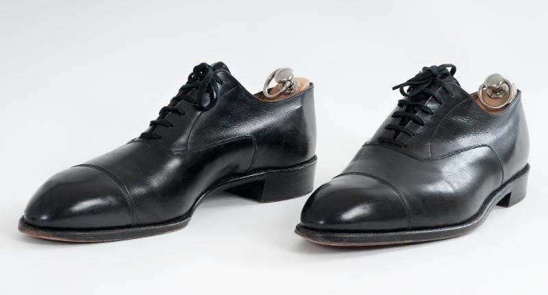 Svart skinn. Nåtlingen består av framstycke med stickad tåhätta och bakstycke med baknåt, täckt med en skinnremsa. Sex par hål. Svart skoband med celluloidspetsar. Svart skinnplös, klädd med vitt skinn, insidan. Läderklack med metallstift. Randsydda. Innersula av brunt skinn, med gulmetall färg i stämpeln. Foder av ljust skinn och bomullstyg. Stämpel i innersula (avritad): A KDS, under sulan även: Santesson. A-märkta. Mått: klack H 2,6 cm, Br 7 cm. Defekter: slitna, svärtade sulor; mindre repor i skinn, klack och foder.