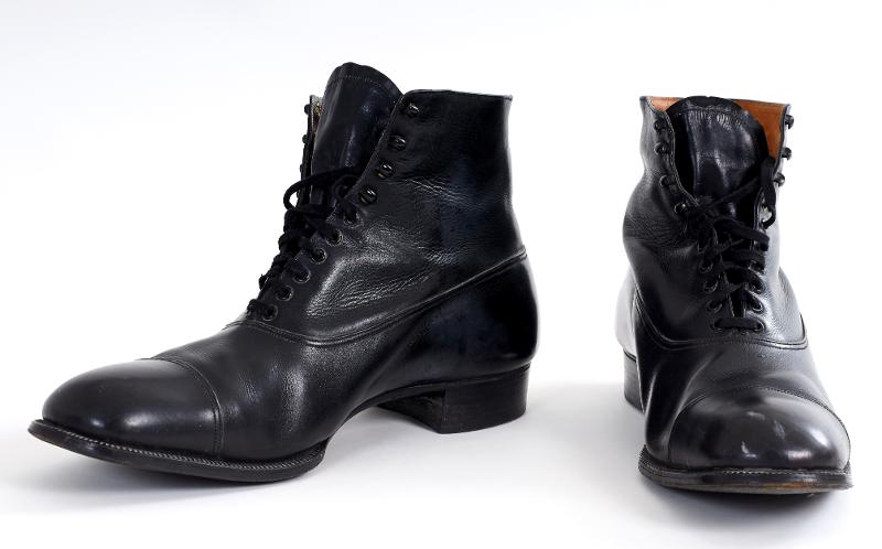 - Svart skinn. Nåtlingen skuren i överdel med baksöm, och tåhätta, skaft med baksöm och plös. Skaft med 6 par skodda snörhål och 4 par häktor. Läderklack och randsydd lädersula. Foder av gulbrunt bomullstyg med firmatryck i guld: Gustaf Johannesson Lund och brun tygstropp. Innersula av brunt skinn. Skador i skinnet. Nästan nya.