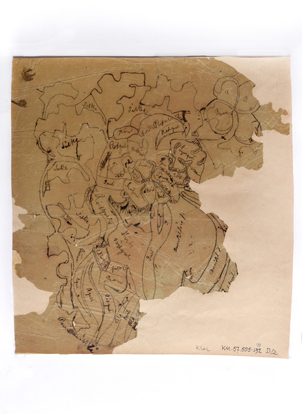 Vävmönster, förlaga till bildväv. Tecknat med blyerts och ifyllt med tusch eller svart bläck. Mittmotiv i form av ett framåtböjt kvinnoansikte i profil, större och mindre färgfält runt om med färgen utskriven i de flesta fälten. I några fält står det "silke".