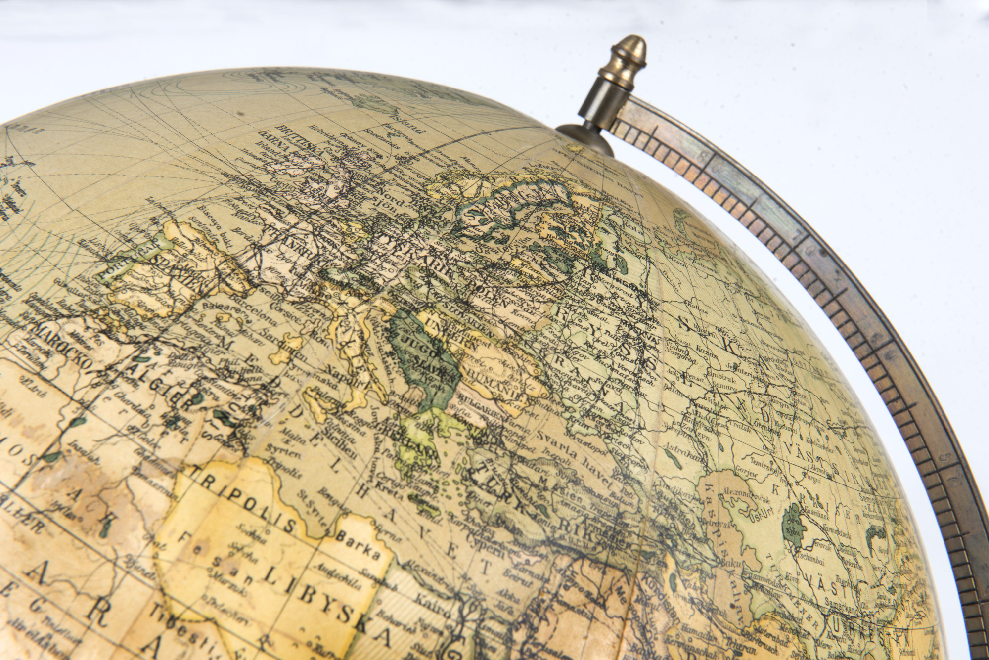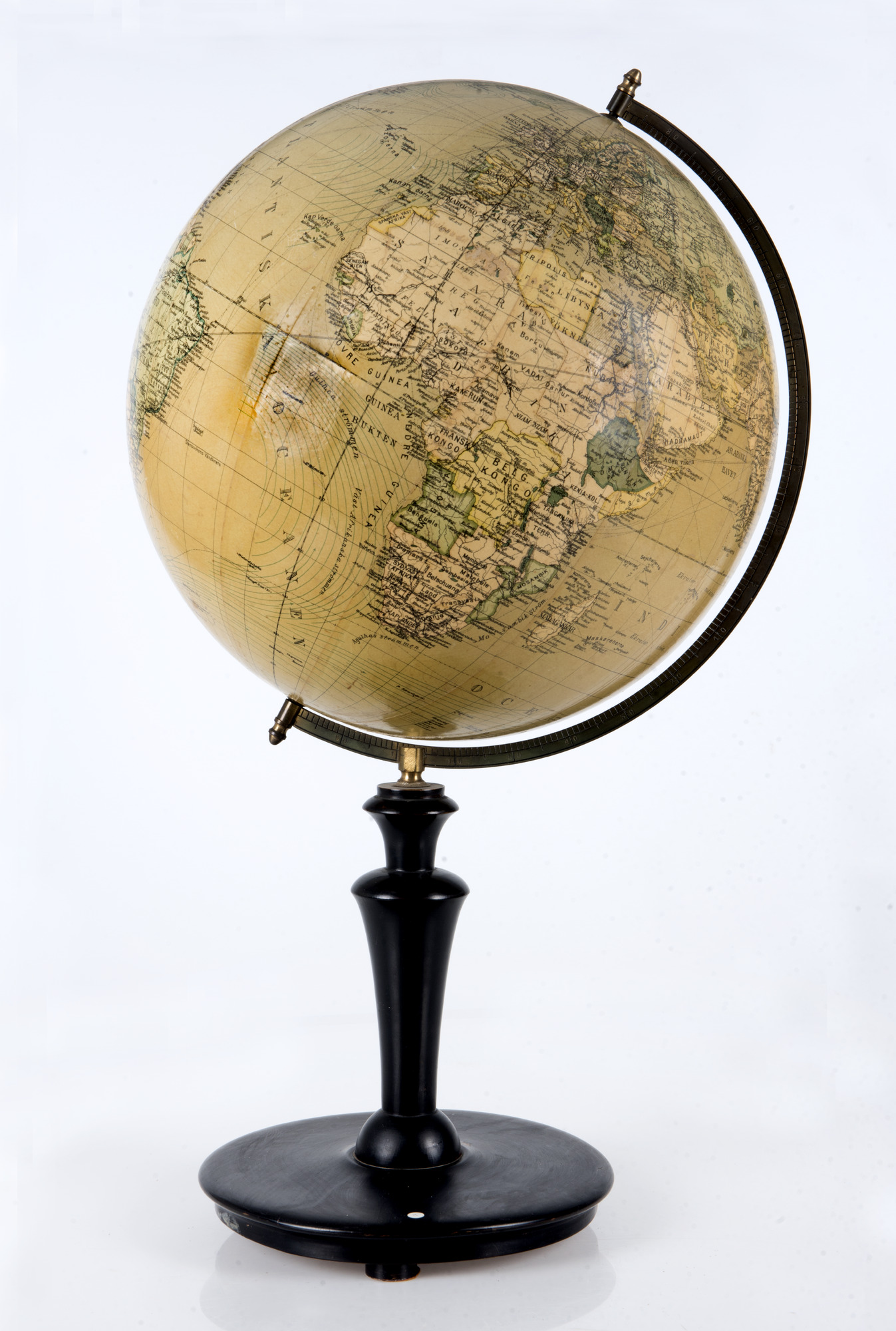 Klot av kartong, svarvad fot av mörkbrunbetsat trä. Gradskiva av gulmetall. Karta med gulbrun botten, geografiska namn samt större folkgrupper utmärkta.