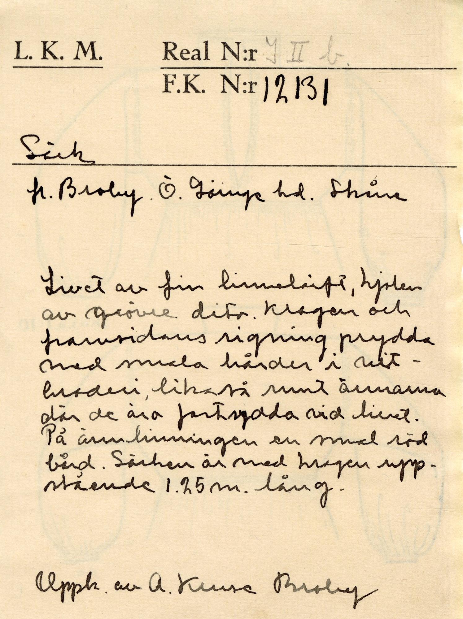 - Vitt linne, tuskaft. Handsydd. Överdel: Bålen skuren i ett stycke utan axelsöm. Ståkrage med 2 knapphål. Ärm utan ärmspjäll slätt isydd mot bålen. Bålen har sned vikning i sidorna. Ärmen är rynkad mot ärmlinningen med 2 knapphål. Foder i grovt linne. Smal Uddspets i framkanterna från kragen 15 cm ner. Överdel, L 32 cm. Krage 8,5 cm. Ärm, L 50 cm. Ärmlinning, Br 1 cm. Nederdelen: 3 våder av grövre linnekvalitet. Rynkad fram och bak, slät i sidorna. Broderi: Plattsöm i vitt lingarn kring framkanter, kragens lång- och kortsidor och på ärm och bål vid ärmens isyning. Plattsöm i rosa bomullsgarn på ärmlinningarna. Nederdel, L 80 cm, vådbredd 63 cm. Trasig och lagningar.