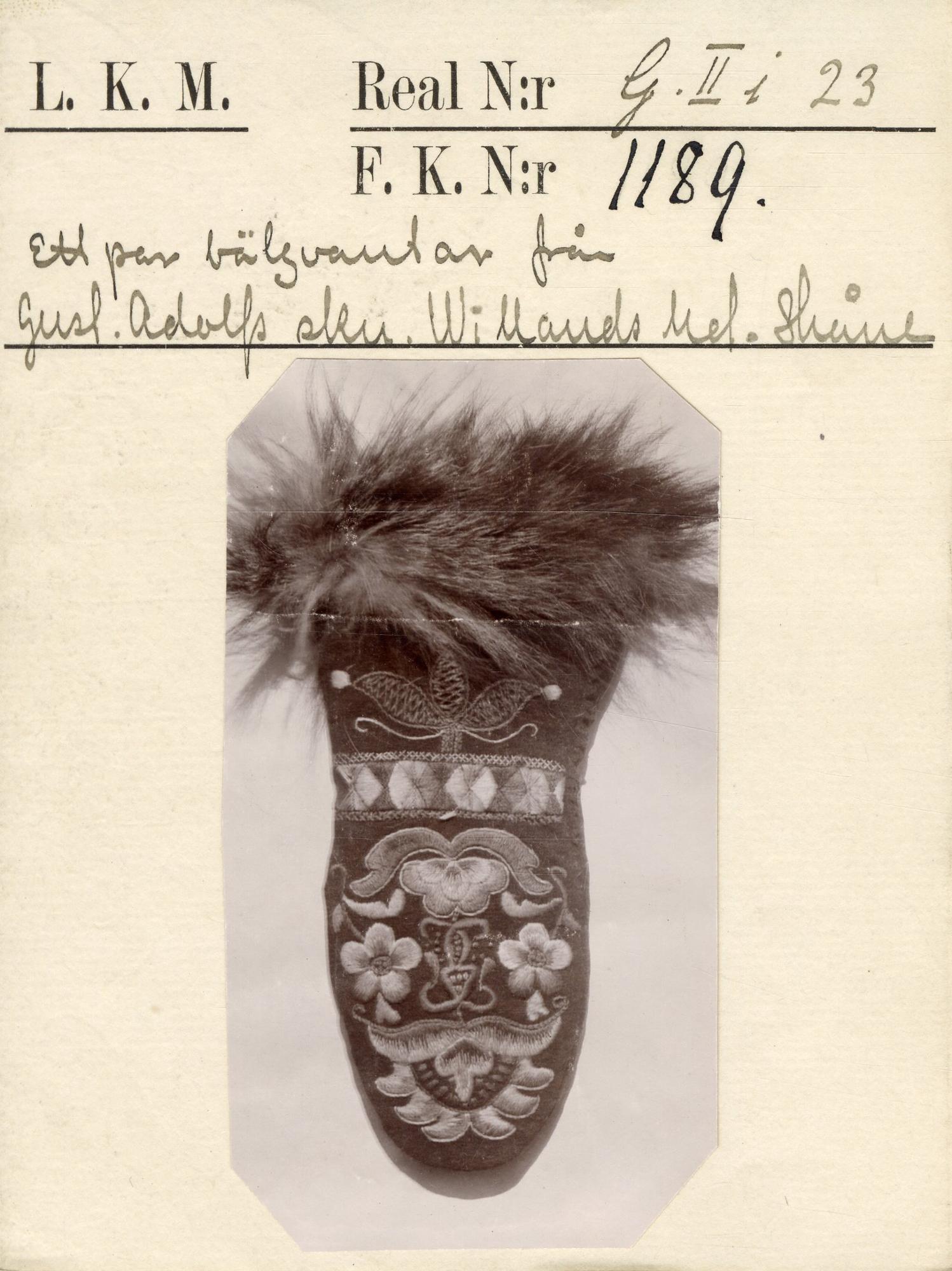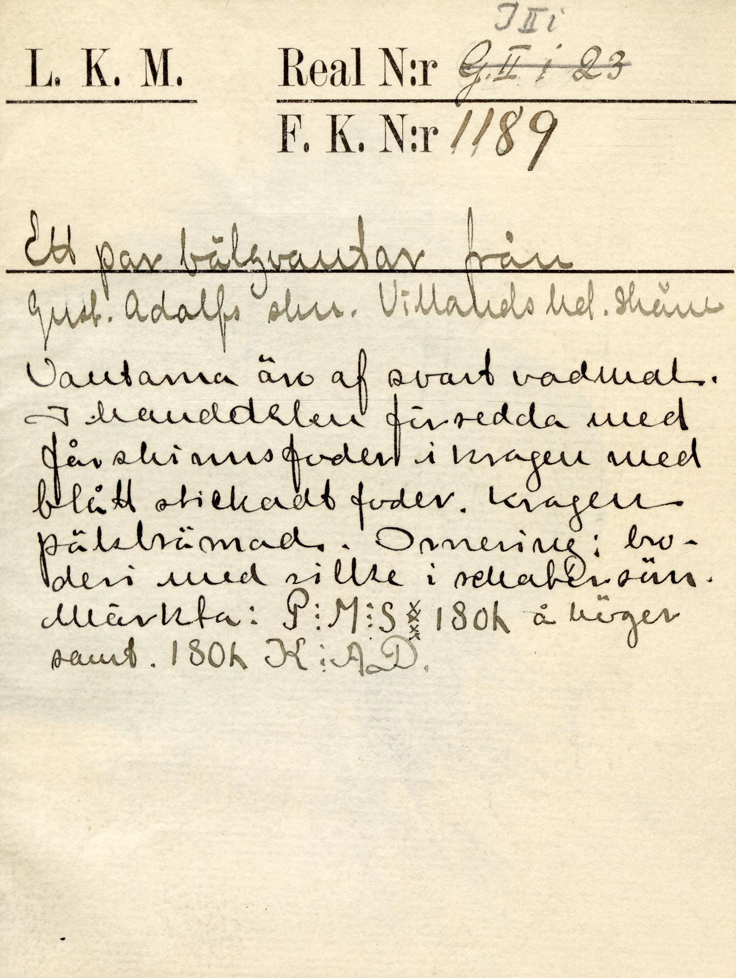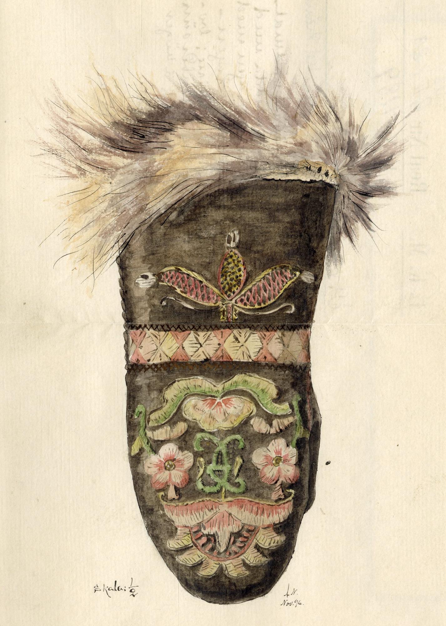 Svart ylle, med skinnbräm. Silkebroderi i flera färger. Monogram PMS 1801och därunder 1801 KAD.