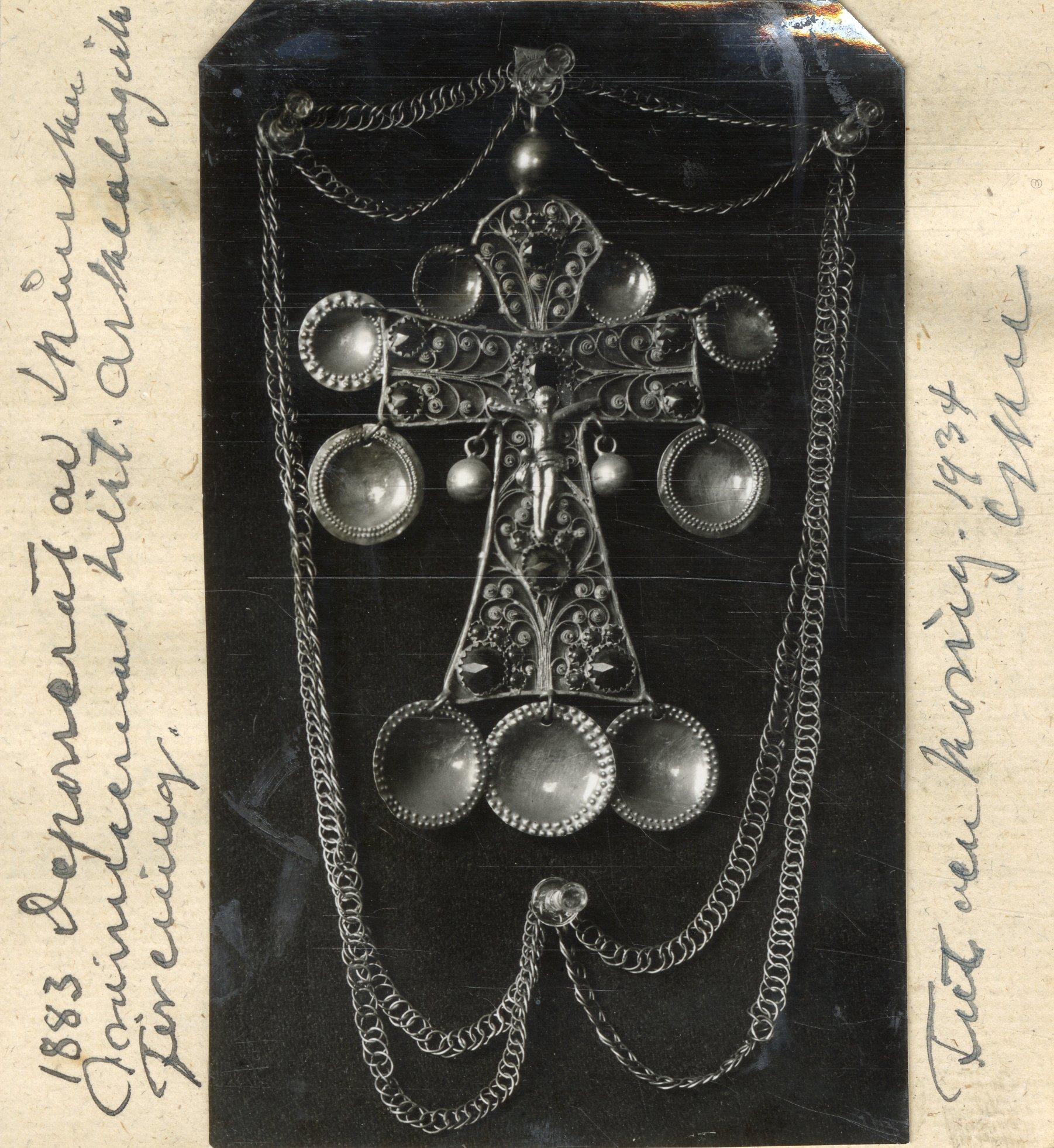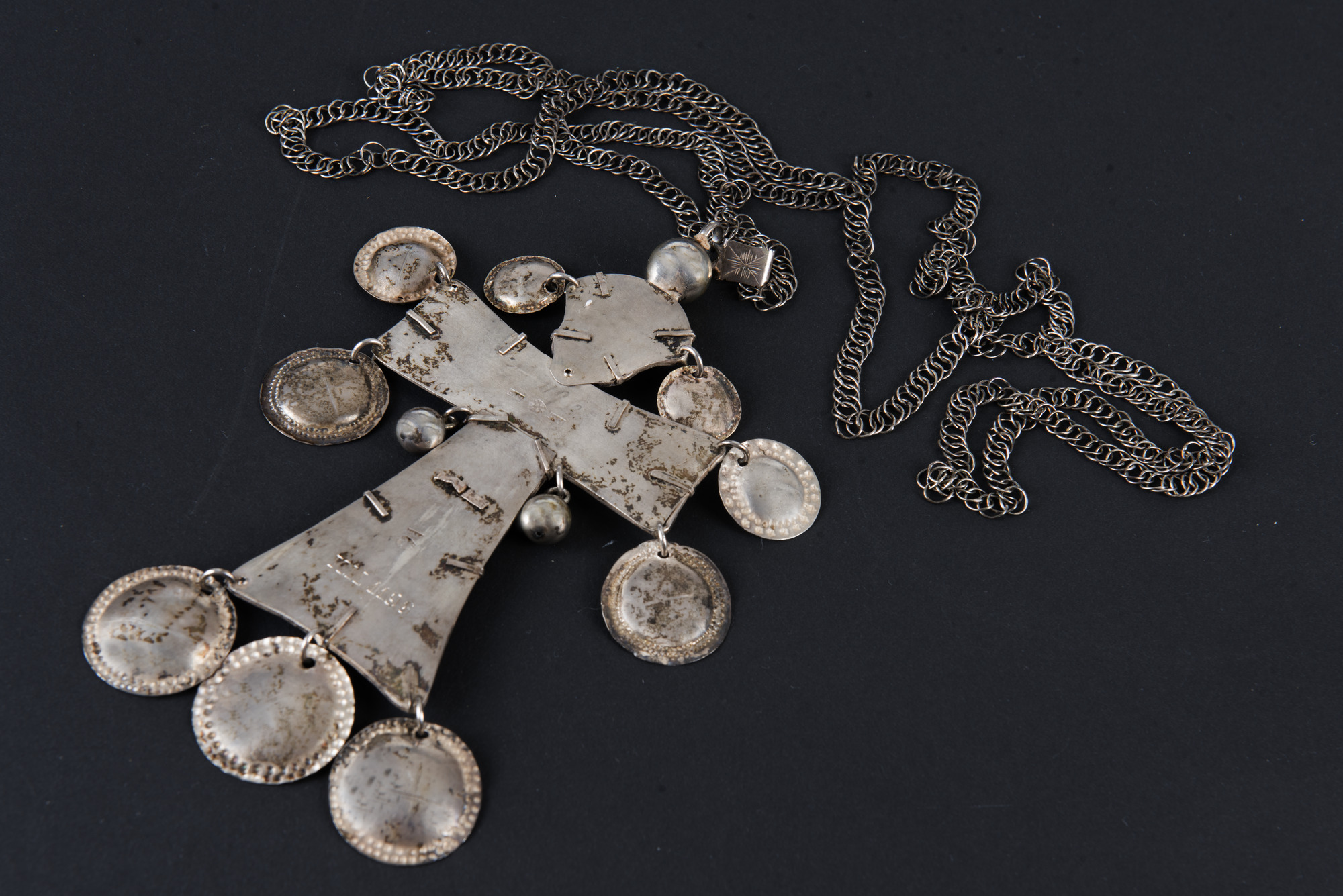 Framsidan förfylld, utom filigranarbetet. Röda och blå glasflusser i olika storlekar. Pålödd Kristusfigur. Nedtill 3 runda löv, korsarmarna med två runda löv vardera, dessutom två på korsets övre del. Alla löven med två rader punsad prickdekor runt kanterna. Under korsarmarna en kula på vardera sida. Överst en kula vid vilken en ögla är fäst. Kedjan manglad med dubbla länkar.
