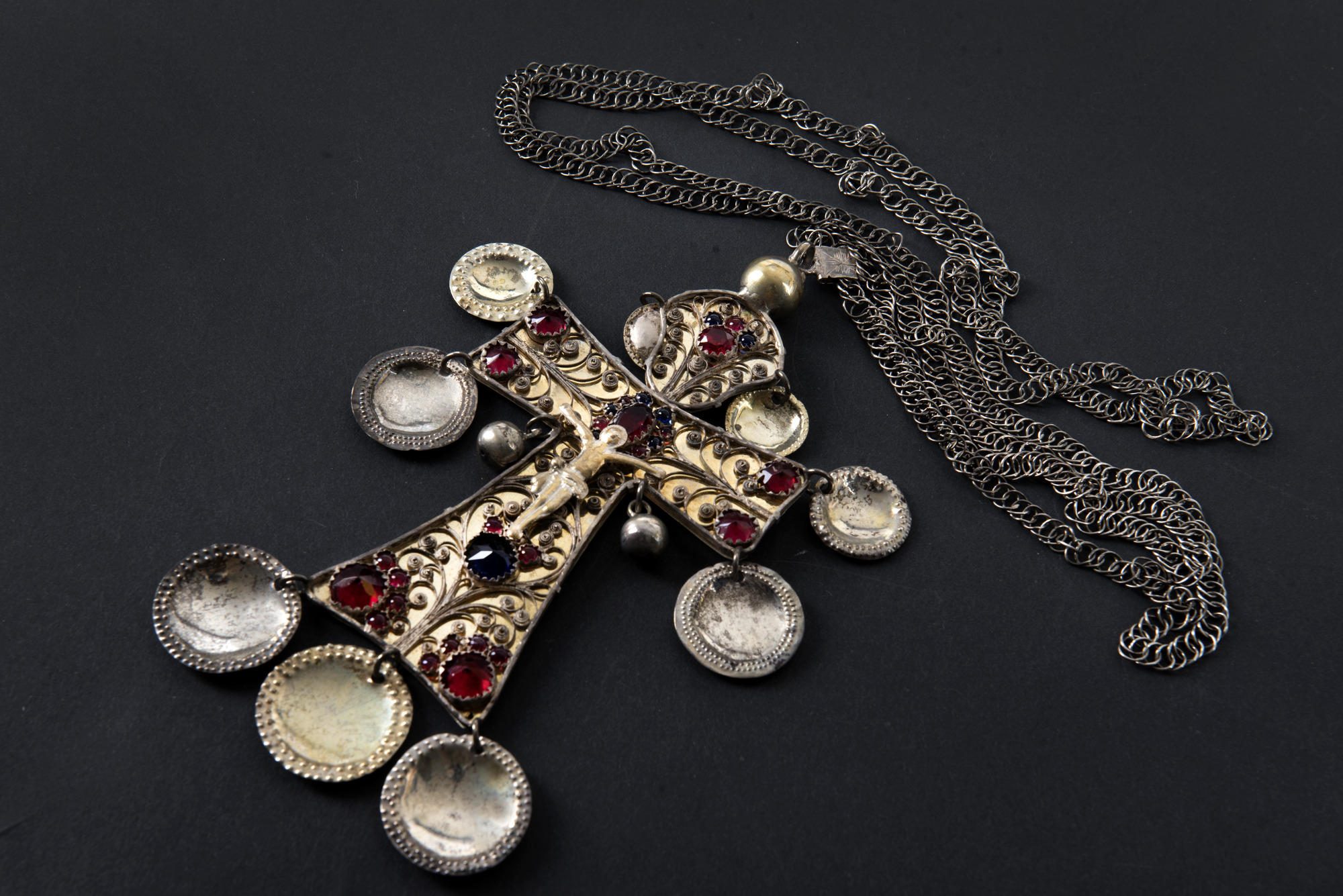 Framsidan förfylld, utom filigranarbetet. Röda och blå glasflusser i olika storlekar. Pålödd Kristusfigur. Nedtill 3 runda löv, korsarmarna med två runda löv vardera, dessutom två på korsets övre del. Alla löven med två rader punsad prickdekor runt kanterna. Under korsarmarna en kula på vardera sida. Överst en kula vid vilken en ögla är fäst. Kedjan manglad med dubbla länkar.
