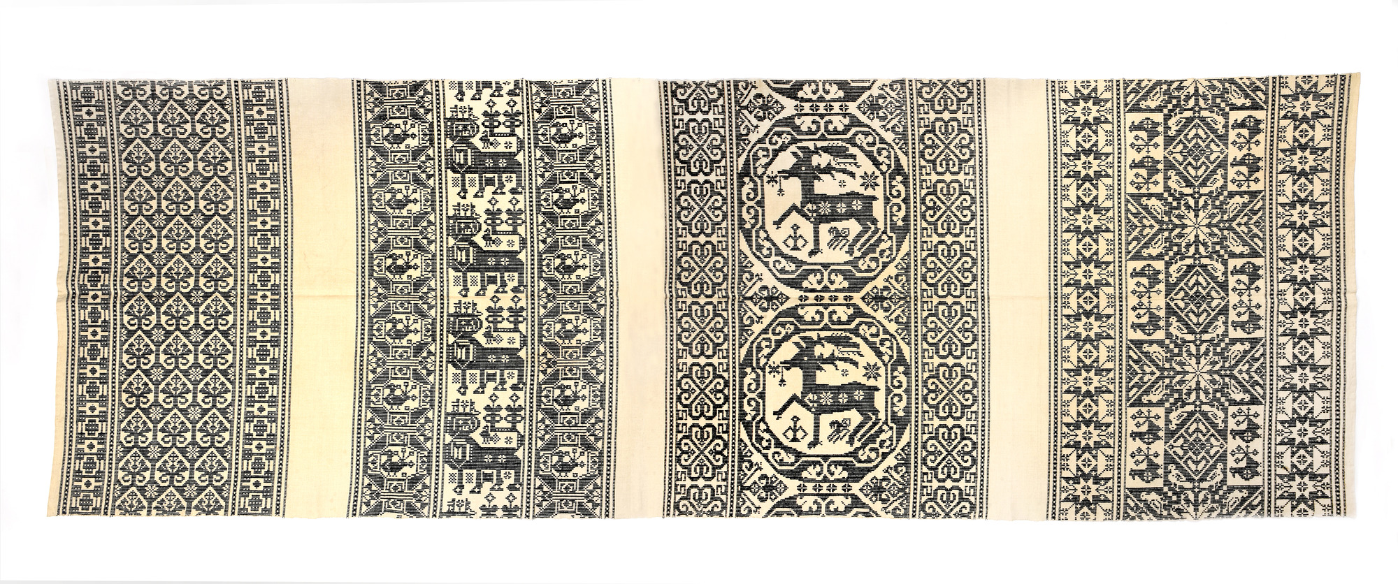 På en botten av halvblekt linne är mönstret inplockat med mörkblått ullgarn. Mönstret består av fyra breda bårder. Den första med stjärnor, den andra med hjortar, den tredje med krönta lejon och den fjärde med hjärtan. Mönstret är vävt så att motivet ska ses från långsidan. Kortsidorna är invikta och tråcklade. I ett av hörnen är ett vitt bomullsband fastsytt. Det är stämplat med lila stämpel med texten "Kulturhistoriska museet Lund", med en stor svart 3:a skriven efter. Kopia av KM 24644, dukagångsdrätt, 1780-tal.
