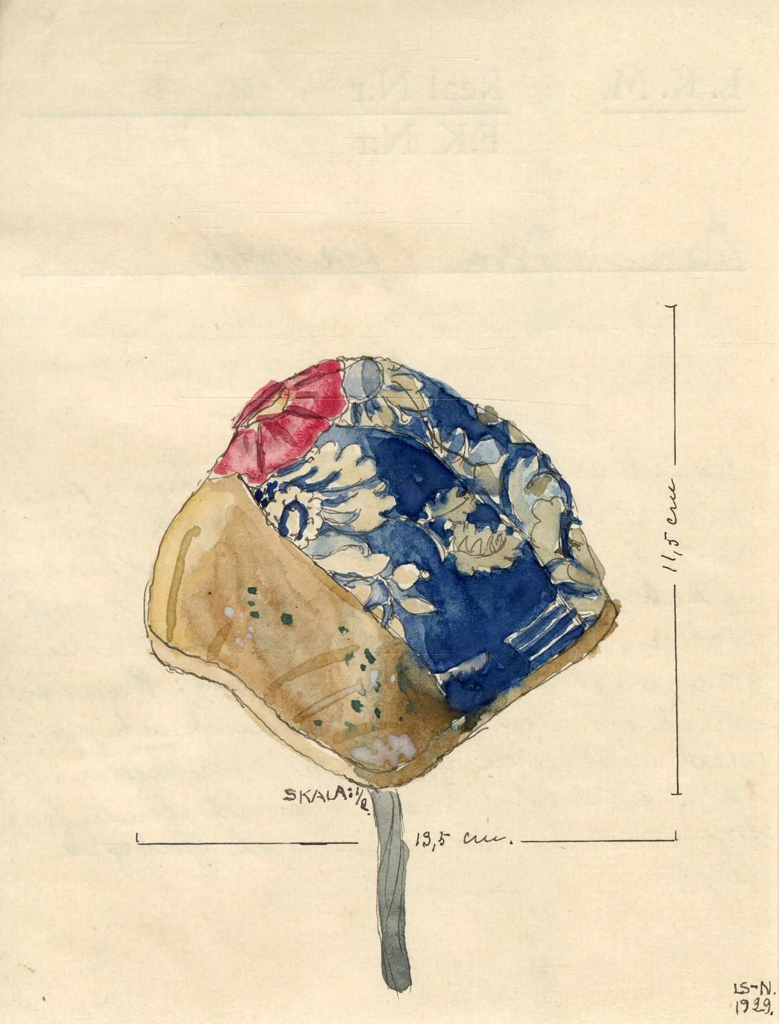 - Pojkmössa. Hopskarvad av 2 sorters tyg i 5 kilar. De 3 främre av blommig sidendamast i blått och gråvitt. Hopskarvade av 8 bitar. De 2 i nacken av ljustbrun sidenbrokad (kan möjligen ha varit ljusröd). Hopskarvade av 6 bitar. Kantad med gulvitt ripstyg. Röd sidenbandsrundel i nacken. Fodrad med ljust linne. Blå linneknytband. Mått 22 x 11,5 cm.
