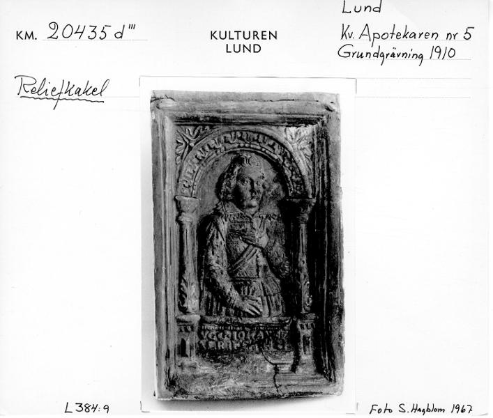Av rödbränt lergods. Framsidan grafiterad. På baksidan rump. Kaklet har varit hörnkakel (vid vänstra hörnet) och rumpen har fortsatt på den nu obefintliga delen om hörnet. Rumpen har på kortsidorna haft genomgående hål. Glasyr saknas. I fältet porträtt med underskrift: VGG.IOHANNES ALBRECH HZM.