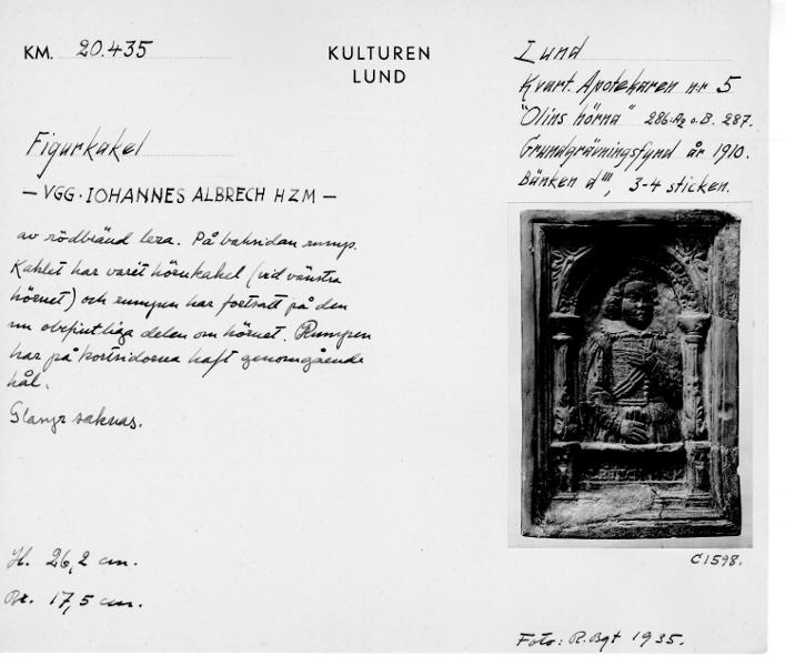 - Av rödbränt lergods. Framsidan grafiterad. På baksidan rump. Kaklet har varit hörnkakel (vid vänstra hörnet) och rumpen har fortsatt på den nu obefintliga delen om hörnet. Rumpen har på kortsidorna haft genomgående hål. Glasyr saknas. I fältet porträtt med underskrift: VGG.IOHANNES ALBRECH HZM.