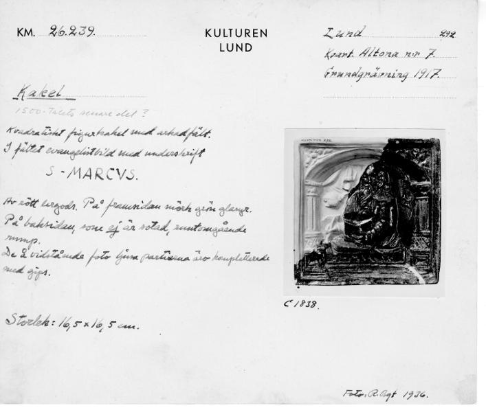 Rött lergods. Kvadratiskt. På framsidan mörk grön glasyr. På baksidan, som ej är sotad, runtomgående rump. Arkadfält, i fältet evangelistbild med underskrift S- Marcus. De ljusa partierna på fotot är kompletterade med gips.