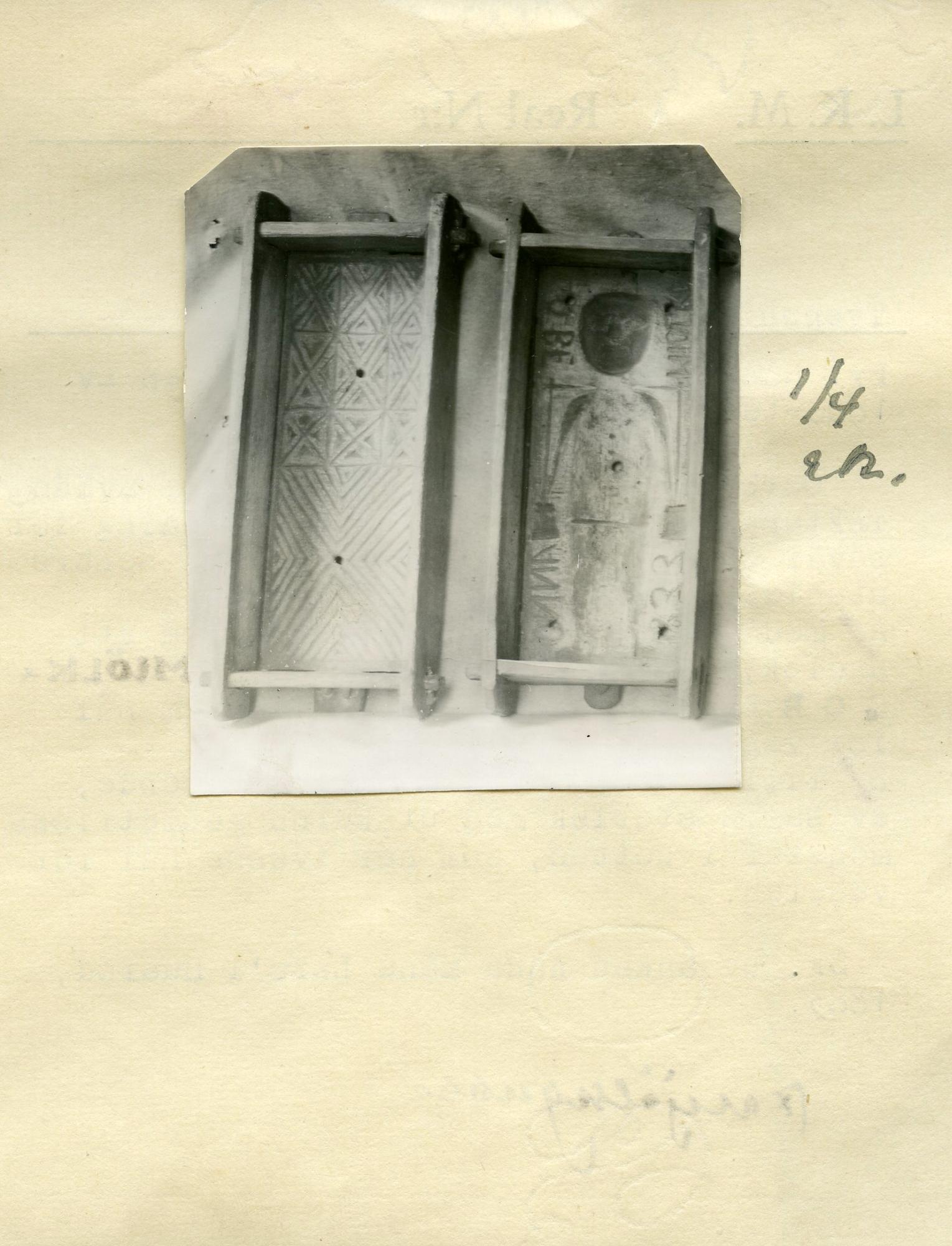 Rektangulär. Geometriska mönster. Gavlarna enkeltappade i långsidorna, tappningarna vågrätt dubbelreglade med träsprintar. Bottnen enkeltappad i gavlarna, tappningarna lodrätt dubbelreglade. Två avrinningshål i bottenskivan.