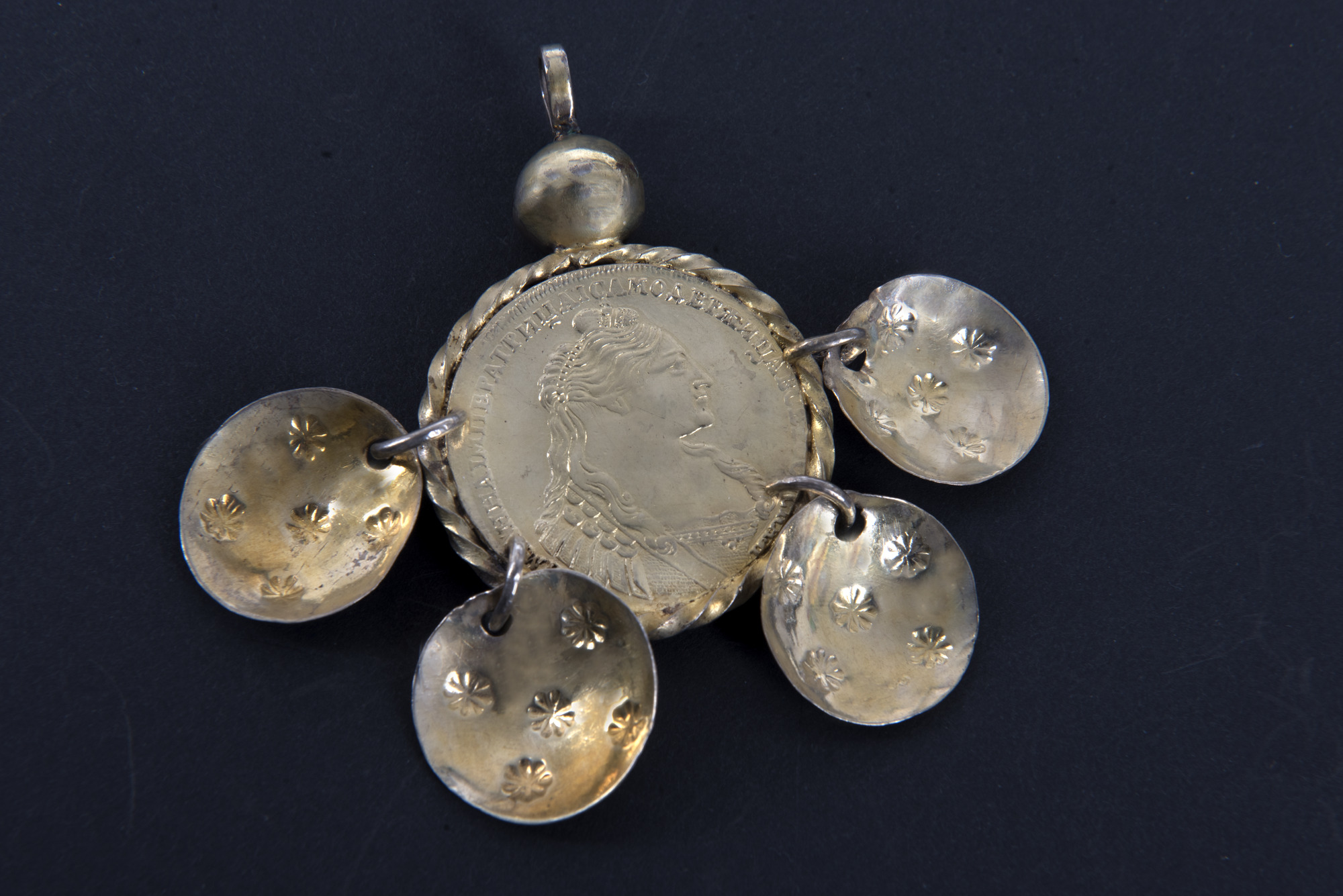 - Framsidan förgylld. I centrum rysk rubel daterad 1736, med porträtt av Anna Ivanovna, kejsarinna av Ryssland 1730-1740. Repstav runt kanten. Upptill slät kula utan gördel, med ögla. Fyra runda, skålade löv med dekor av fem stjärnor vardera.