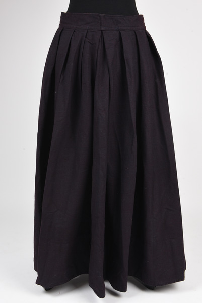 Sydd av mörkbrun verken med dragning åt lila. Verken är ett halvylletyg med bomull i varpen och ull i inslaget. Tyget är inskrivet på KM 97798. Kjoltyget är lagt i ljupa veck mot linningen, vecken viks bakåt och möts i ryggen med ett stort motveck. Linningen är 5 cm bred, fodrad på insidan med ett brunt linnetyg. Knäpps med hyskor och hakar över ett 31 cm djupt sprund mitt fram, skodd med ett mörkblått linnetyg. Samma tyg är även kjolfållen skodd med, cirka 15 cm.