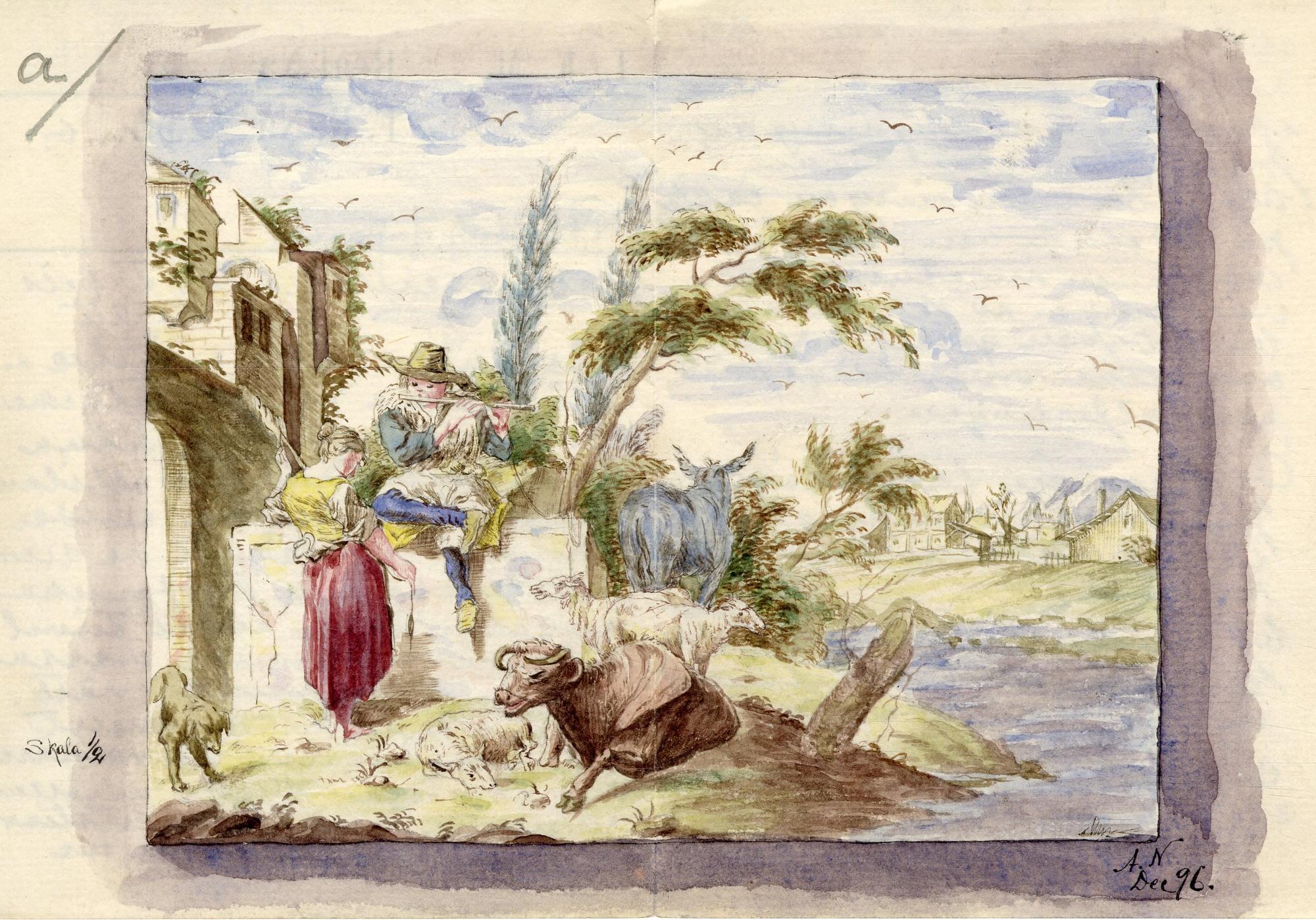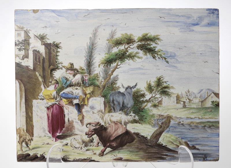 Polykrom, muffeldekor. Pastoral scen i ruinlandskap, flöjtspelare, träd, djur.