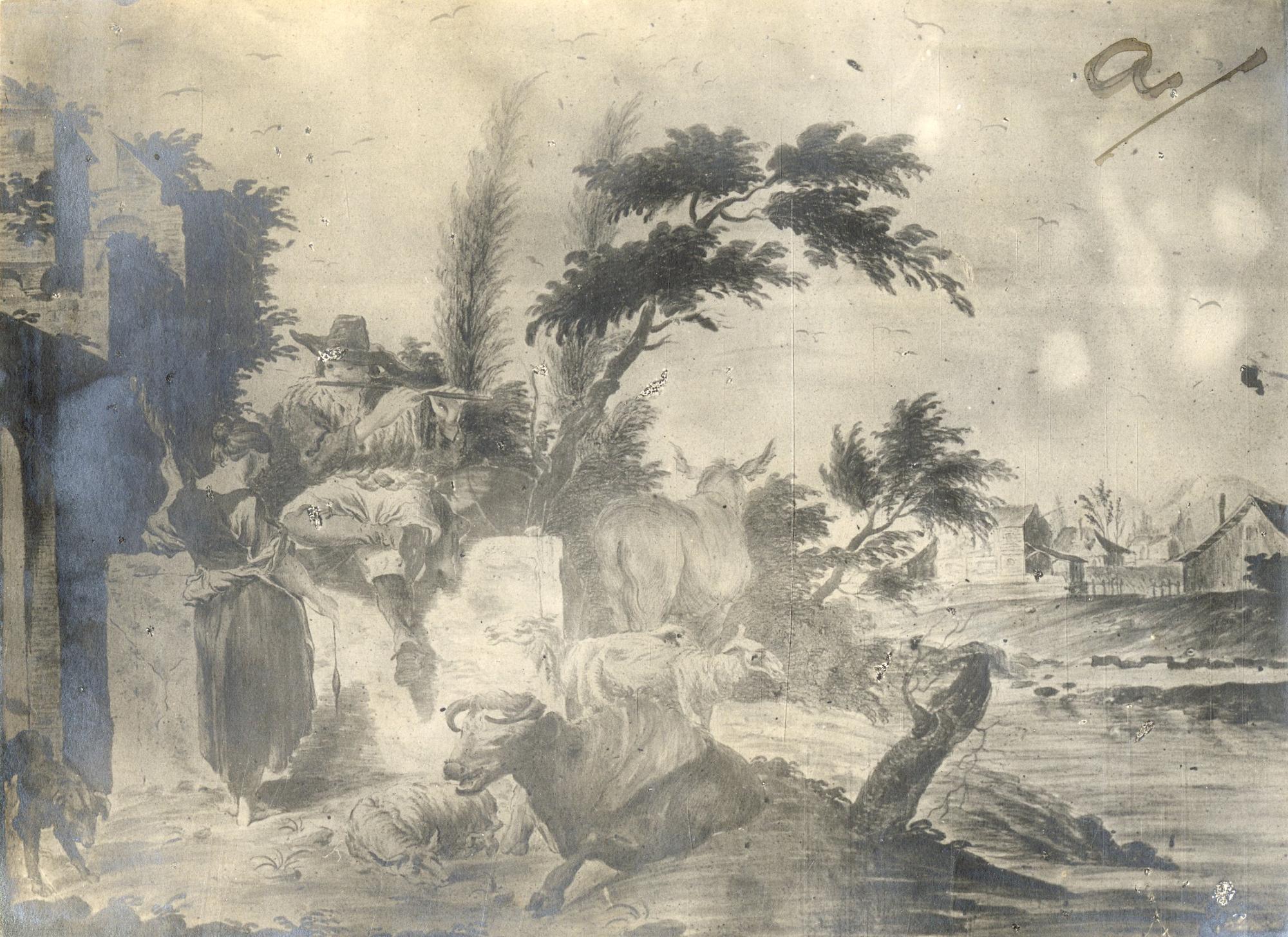 landskap; ruin; hus; man; flöjt; djur; ko; vattendrag; himmel; hund; får; träd