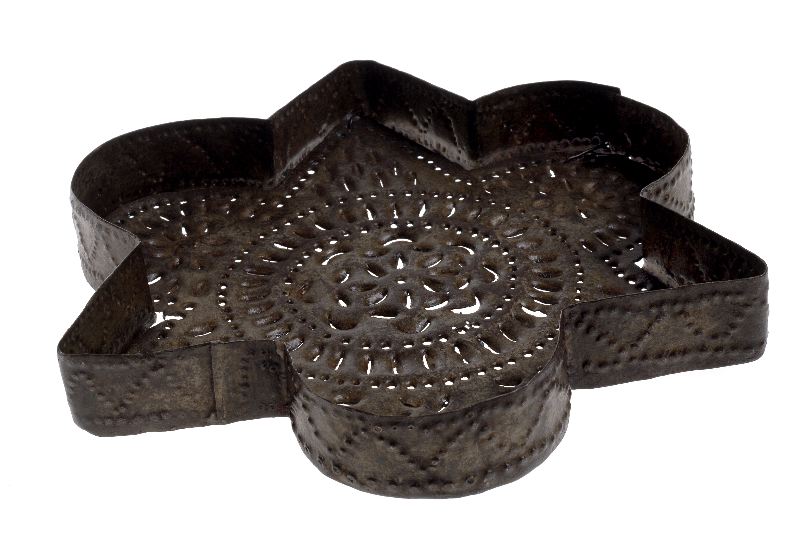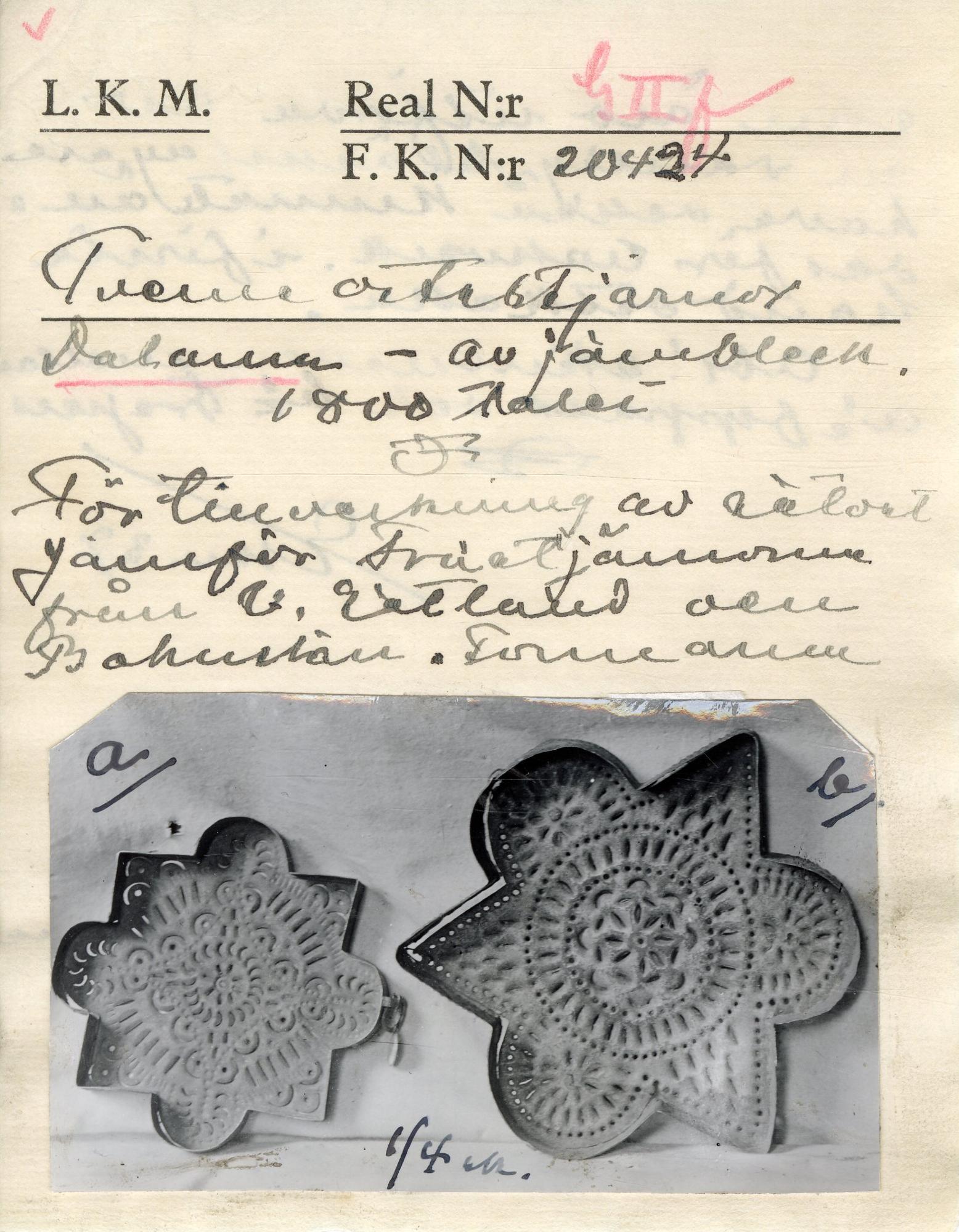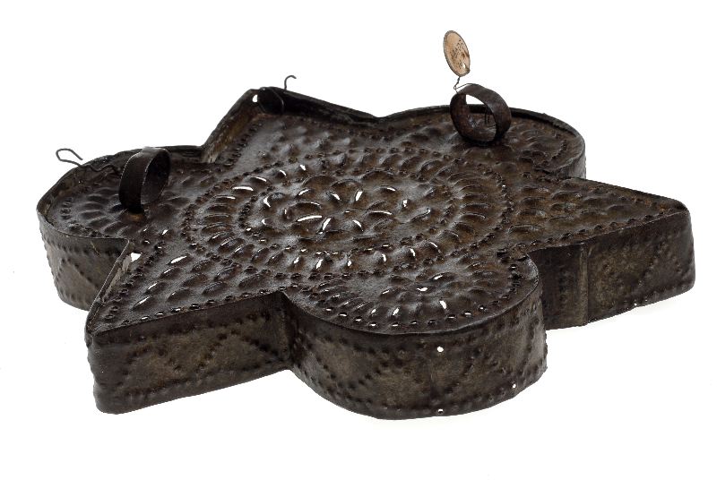 Till formen ett tre pass med uddar emellan, bottnen perforerad med hål, huggna med mejsel i olika former. Sidorna dekorerad med sick-sack-mönster som slagits med rund stans.