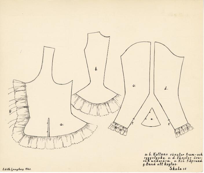 - Vit med 8 cm bred uddklippt volang framtill och runt nederkanten. Helt fodrad med linne. Djup halsurringning, lång stängd ärm med volang vid handleden. Vita band att knytas till rosetter framtill, ungefär 3 cm breda.