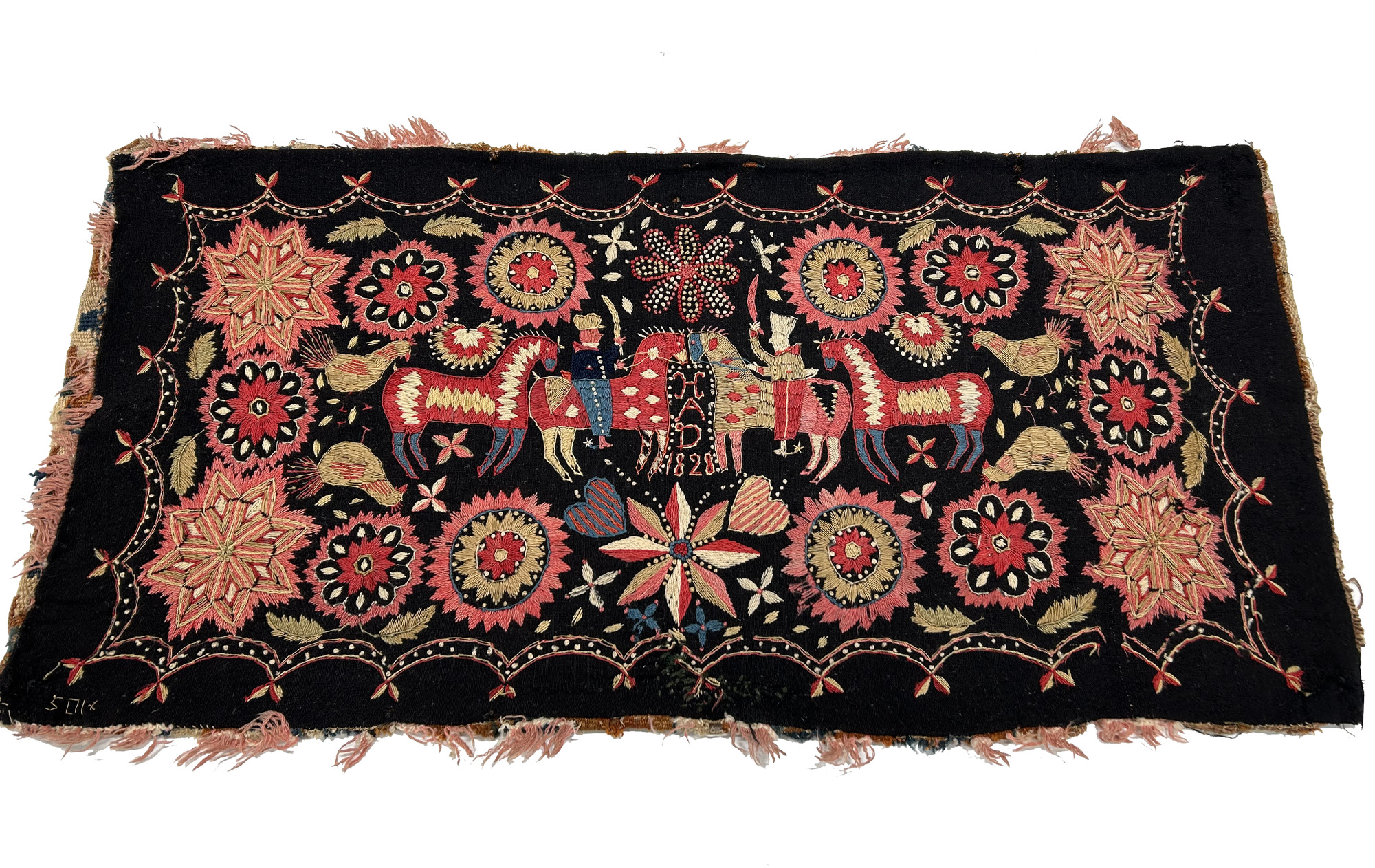 - Polykromt broderi på svart botten, utfört i tvinnat och otvinnat garn i rött, rosa, gult, blått, orange och vitt. Motivet föreställer enligt uppgift Holger Danske och Burman till häst, med ytterligare vars en häst samt 2 fåglar på vardera sidan. Stora blommor runt om centralmotivet. Baksidan en gammal rölakansåkdyna, skarvad med dess baksida som är randig i brunrött, gult, blått, grönblått och vitt. Knuten frans i rosa och vitt garn.