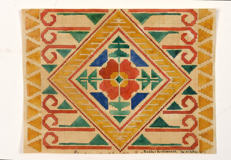 - Mönster för kudde i HV-teknik. På ett förtryckt rutpapper, 1,5x15, mm, är ett mönster ritat med blyerts och färglagt med vattenfärg. I mitten en bred, gul rombformad ram med en smal, röd rand längs både ut- och insidan. I romben finns en stiliserad, röd blomma med en stjälk med blad från rombens fyra hörn. Utanför romben finns horisontella, röda streck med en krok ytterst mot kortsidan, samt gröna streck med trekanter mot romben. Längs kortsidorna en bård med gula trianglar. Svart text nertill: "Kudde i HV-teknik, kop. av Edith Ljungberg". Text med blyerts på mönstrets baksida; "Foto E 507:4".