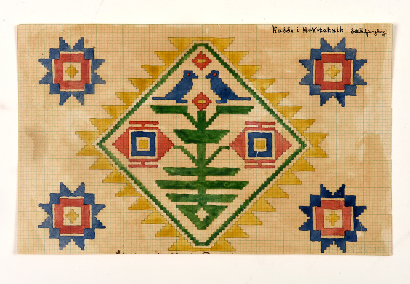 Mönster för kudde i HV-teknik. På ett förtryckt rutpapper, 1,5x15, mm, är ett mönster ritat med blyerts och färglagt med vattenfärg. I mitten finns en romb med gultaggig kant utåt och en smal, grön rand innåt. I romben finns en stadig planta, med två röda och blå blommor, samt två fåglar. I varje hörn utanför romben finns en blå stjärna med en röd fyrkant med en gul prick i. Svart text i övre högra hörnet: "Kudde i HV-teknik, av Edith Ljungberg". Text med blyerts på mönstrets baksida; "Foto E 509:2".