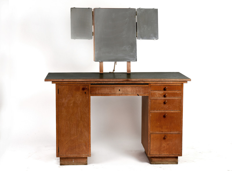 Omarbetat skrivbord, lackerad björkfaner. Två hurtsar, till vänster ett skåp med låsbar lucka och till höger 5 lådor i olika storlekar. Indragen sockel under hurtsarna. I mitten en 50 cm bred låda med lås. Mellan den mittersta lådan och skrivbordsskivan finns en öppen springa där en utdragbar skiva eventuellt kan ha suttit. Bordskivan, med två 24,5 cm långa, sågade skåror i bakkant, bär spår av tidigare ”beklädning”. Lös extraskiva, 125x52,5x2 cm, med grön linoleum(?) yta på vilken en spegel i tripodi-modell skall fästas. Spegeln hemmabyggd av plywood, med två ben av trä och ett stöd av metall mitt bak. Svarvade träknoppar på både lucka och lådor. Nyckelskyltar av gulmetall. Den högra hurtsen har två rostiga skruvar isatta med 15 cm mellanrum, 47,5 cm från golvet, på utsidan. Lådorna innehåller rester av Benkt-Åke Benktssons smink; hårnålar, läppstift, burk med hårvax(?) och puder padd.