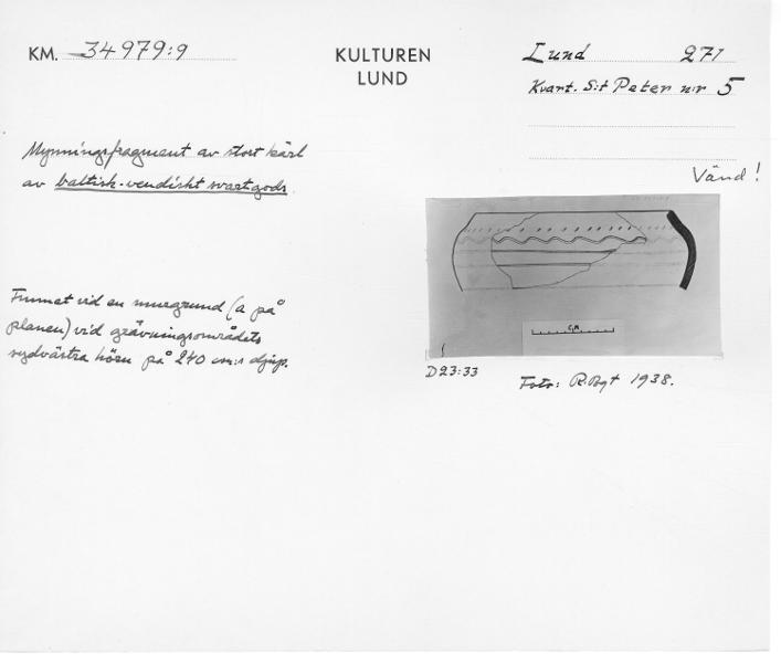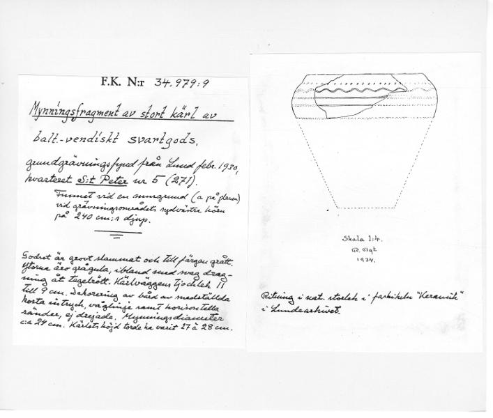 Karlins katalogkort: Godset är grovt slammat och till färgen grått. Ytorna äro grågula, ibland med svag dragning åt tegelrött. Kärlväggens tjocklek 11-9 cm[?]. Dekorering av bård med snedställda korta intryck, våglinje samt horisontella ränder, ek drejade. Mynningsdiameter c:a 24 cm. Kärlets höjd torde ha varit 27 á 28 cm.; Mynningsfragment av stort kärl av baltisk-vendiskt svartgods.