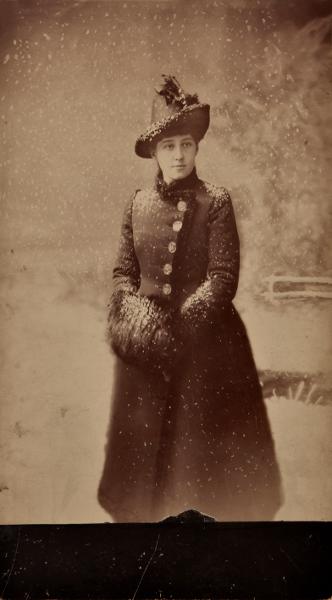 - Fotografi, svarvitt; bröstbild, kvinna sedd framifrån, blus med spetsmönster, figursydd jacka, medaljong och kejda; lockat hår; tryckt signatur Roaslie Sjöman Halmstad. Porträttet föreställer troligen hennes dotter Alma (efter jämförelse med andra porträtt av henne). Monterat på tjock pappa med avfasade kanter målade i guld.