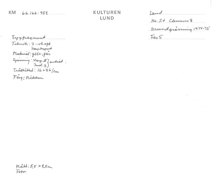 Tygfragment. Ylle, får. 3-skaft varpkypert. Varp Z, inslag S, entråd. Trådtäthet 16x9 tr/cm. Mörkbrun.