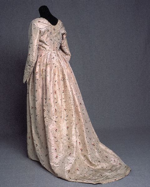 - Rosafärgat brokadsiden med invävda ränder i vitt och svart och blomsterkvistar i rött, svart, grönt och ljusblått. Liv och kjol sammansytt. Livet fodrat med vit linnelärft. Lång svängd ärm. Livet rynkat framtill, öppning mitt fram där det knyts samman med rynkbanden. Kjolen har släp, rynkad fram och veckad baktill. Öppningen mitt fram på livet går ner i sprund på kjolen. Detta sprund är fastfållat de första centimetrarna och sedan kastat till resten. Sprundet är inte i en söm, utan uppklippt. Tolkning: Den sista delen av sprundet som är kastat kan vara sekundärt. Den övre delen kan häröra från en underkjol eller tompense till en klänning av robe à la francaise eller à la anglaise-typ. Dessa brukar mittfram på mittframvåden ha ett ca 3 cm djupt sprund. Liksom på denna klänning brukar detta finnas mitt i en hel vådbredd. Denna tolkning stöds av det faktum att hela nederdelen av kjolen är påskarvad. När robens kjol flyttats från midjan upp under bysten har den blivit för kort och skarvning nedtill blev nödvändig. Dragsko mellan kjol och liv på ena sidan går ej att släta ut vilket är möjligt på den andra. Rynkorna är fastsydda till varandra. Den tråd som använts för detta är samma tråd som använts för att applicera en gasväv på insidan av släpet bak, sekundärt vid samma tillfälle. Sömnaden av livet kan ha tillgått så att fodret utan ärmar har först provats in. Sedan har sidenet applicerats, först mitt bak, sedan övriga delar i tur och ordning. Ärmarna sist.