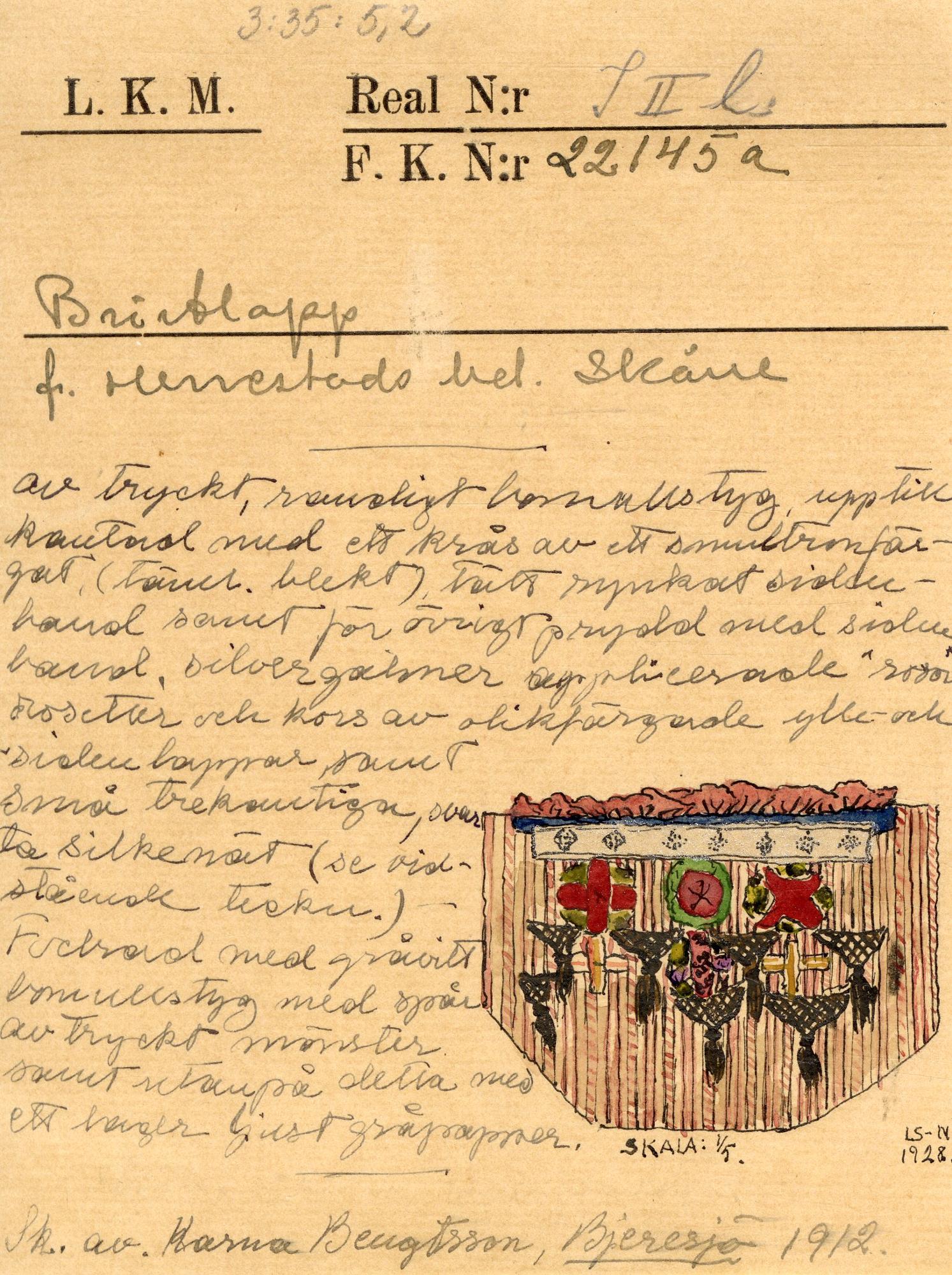 - Tryckt, randigt bomullstyg. Upptill kantad med ett krås av ett smultronfärgat (tämligen blekt) tätt rynkat sidenband samt för övrigt prydd med sidenband, silvergaloner, applicerade rosor, rosetter och kors av olikfärgade ylle- och sidenlappar samt små trekantiga svarta silkenät. Fodrad med gråvitt bomullstyg med spår av tryckt mönster samt utanpå detta med ett lager ljust gråpapper.