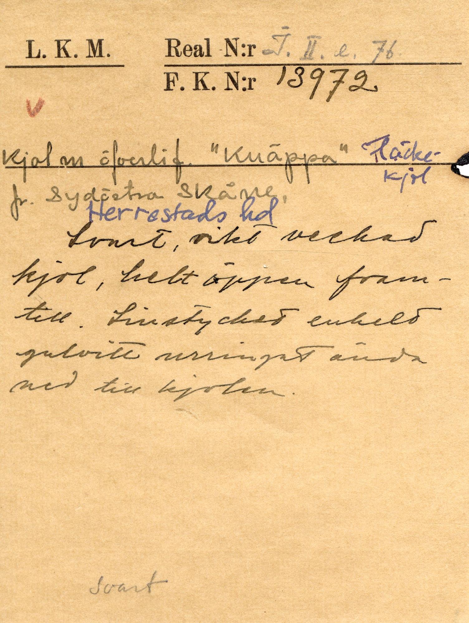 Livet av ursprungligen rödbottnad skuren sammet med mönster i svart. det senare nästan utplånat och botten urblekt till guldbrons. Mycket trasig i ryggen. Fodrad med lärft. Kjol av svart kraftigt ylletyg, helt öppen fram. Öppningen skodd med bomullslärft, bredare upptill. Nertill förstärkt med 2 lappar av brunviolett ylletyg. Tätt plisserad runt om, utom mitt fram. Ofodrad samt något sliten och maläten. Knäpps mitt fram i midjan med mässingshäkta och hyska.