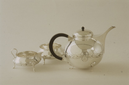 Kaffeservis, silver, formgiven av Wiwen Nilsson, föremål i privat ägo fotograferade och inlånade till utställningen Modernismen. Färgdia.