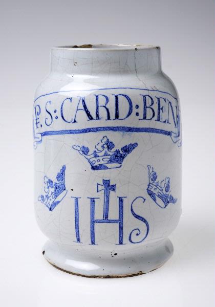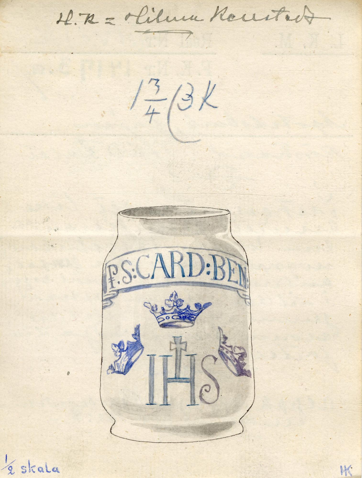 Med blå starkelsdekor och text: P. S: CARD:BEN:/ tre kronos samt IHS.