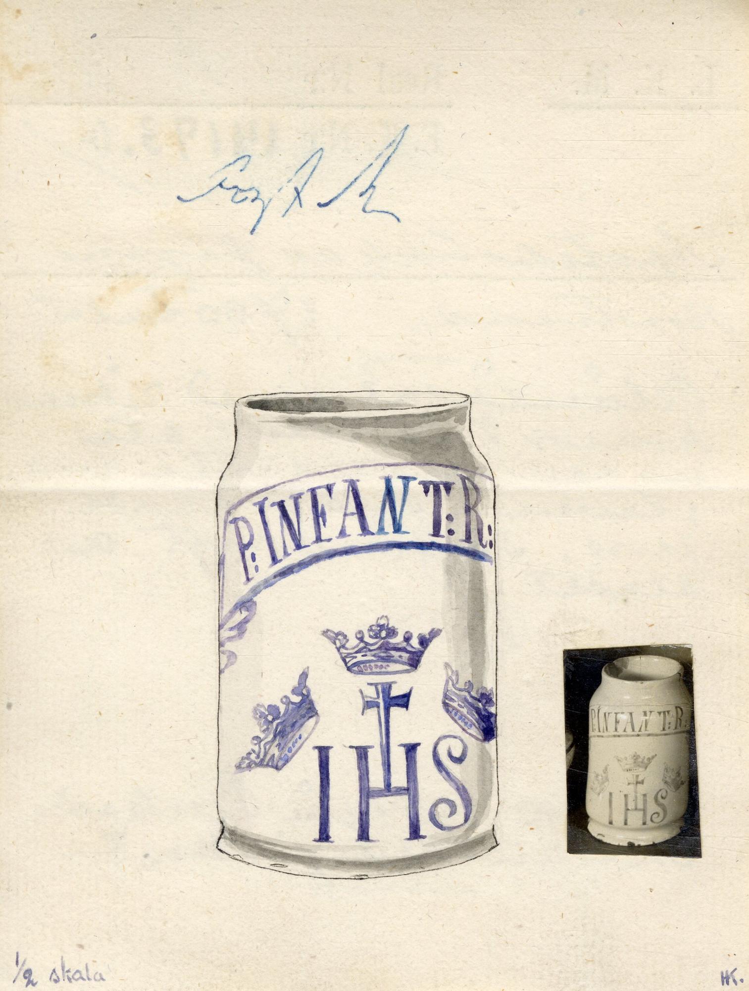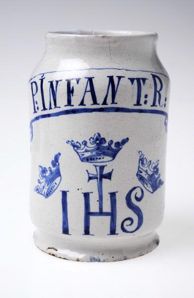 Med blå starkelsdekor och text: P: INFANT:R/ samt tre kronor och IHS.