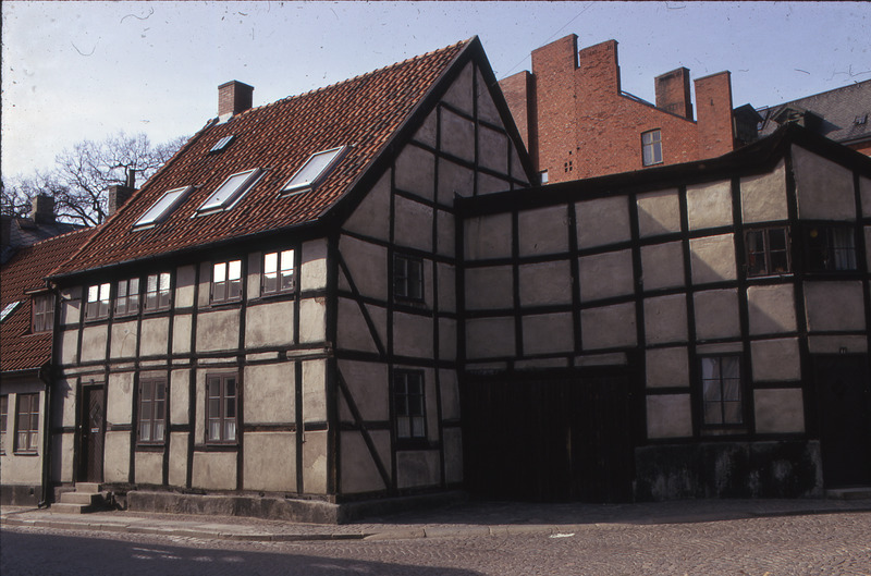 byggnad; exteriör; gata; himmel; hus; korsvirke; kullersten; stadsbebyggelse; trottoar; träd