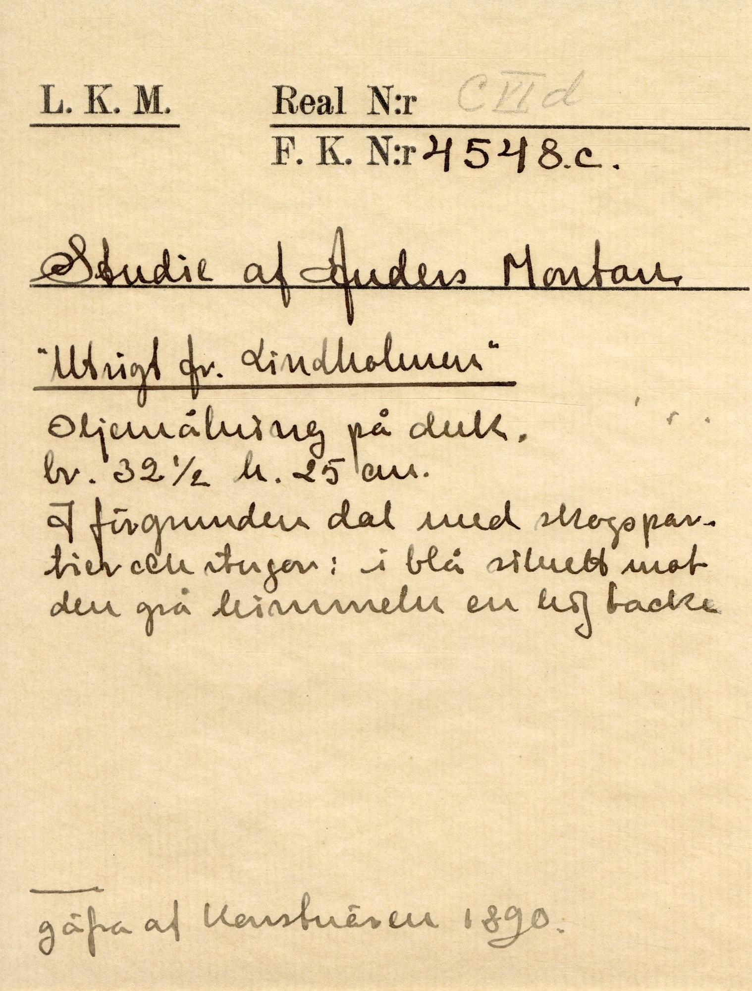 Förteckning öfver skisser och studier af Anders Montan Düsseldorf. Skänkta af konstnären till Kulturhist. Museet i Lund [Samtliga målningar äro utförda i oljefärg å duk, en del uppfodrade på kartong (K). Bildytans storlek angifves i cm. bredd x: höjd. De flesta målningarna äro försedda med af konstnären egenhändigt skrifna lappar angifvande motivet.-I museets förvärfskatalog för 1890 upptages å N:r 5042 nittio studier och skisser af A. Montan; vid inventering 1918 i april funnes endast nedan förtecknade 85 st kvar.(samtidigt införda 76 st å N vis 4541-4549 och 9 st å 5042)